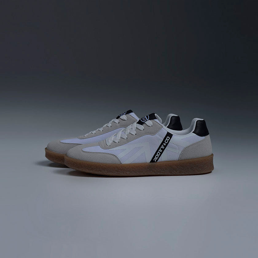 Estos tenis ofrecen una silueta clásica y atemporal con un enfoque minimalista que combina confort y estilo vintage de manera impecable. Su diseño de corte bajo es versátil y fácil de combinar, siendo ideal para elevar cualquier outfit casual, desde jeans hasta pantalones chinos. La capellada juega con el contraste de texturas, utilizando paneles de cuero sintético blanco y secciones de gamuza (suede) en tono crema o gris claro, que evocan la estética deportiva de los años 70 y 80. La suela de goma color caramelo (goma natural) no solo proporciona un agarre excelente, sino que sella el look retro que distingue a este calzado.