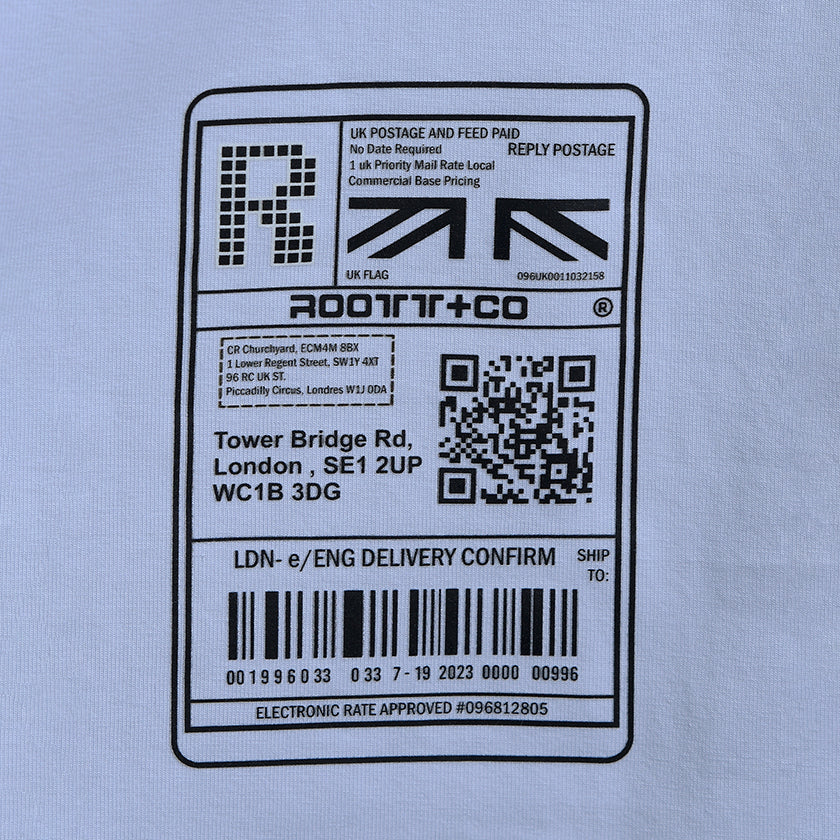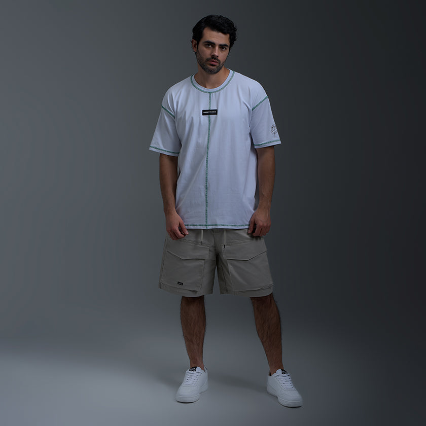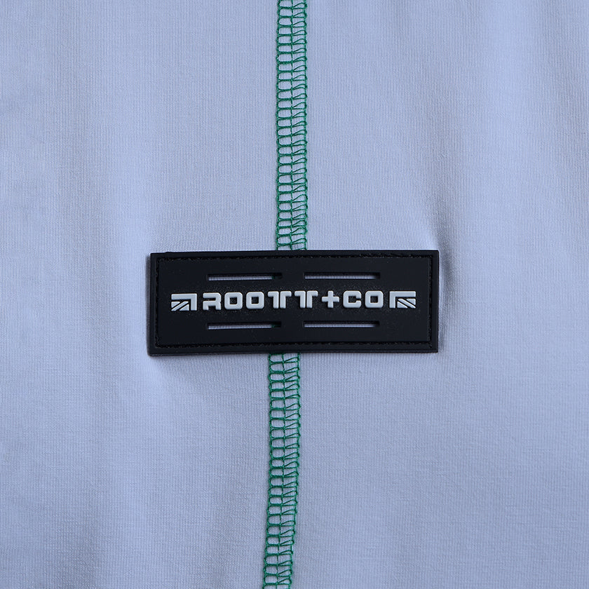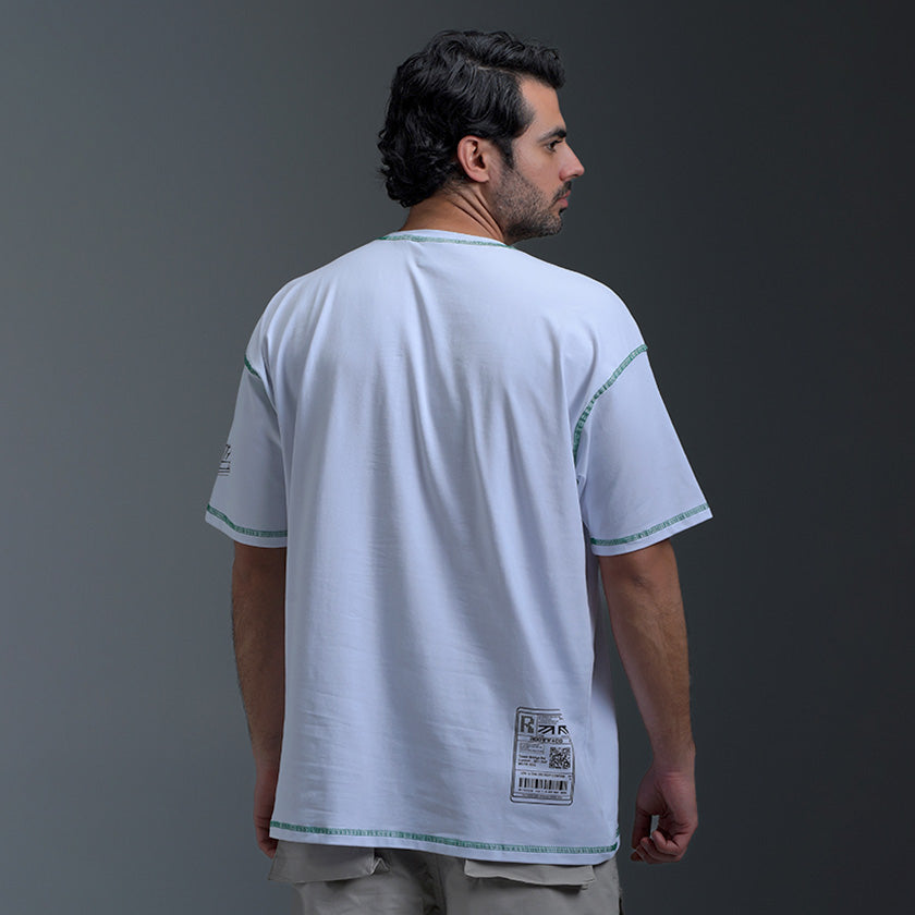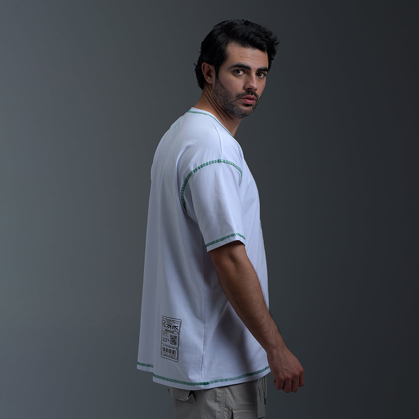 Camiseta Oversize presenta sello de calidad ROOTT+CO en el pecho y estampado en la espalda, su corte vertical en el centro y costuras verdes remata el diseño de la prenda. Luce marquilla código en el costado.