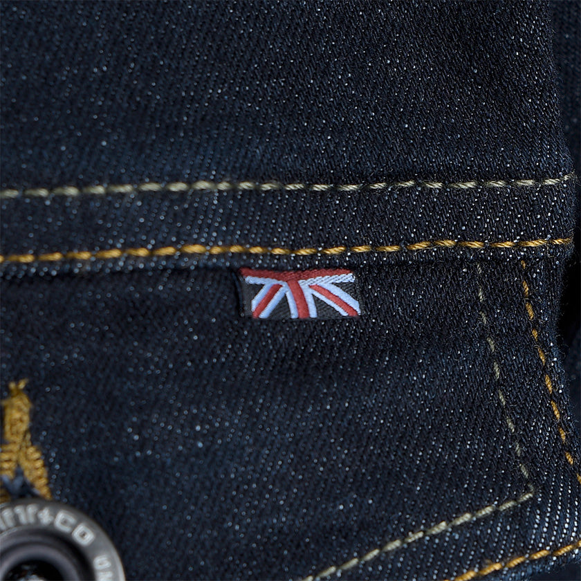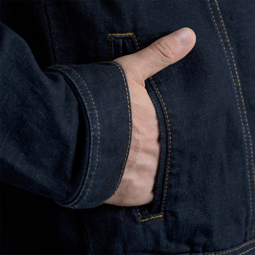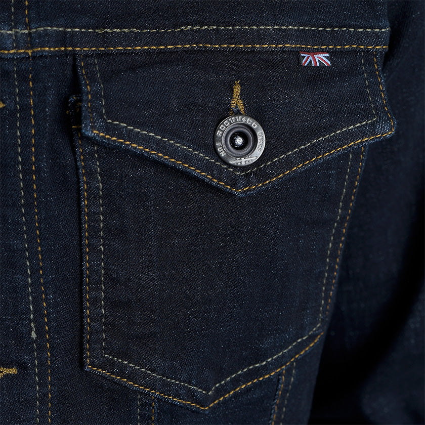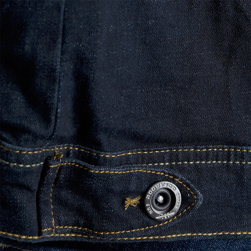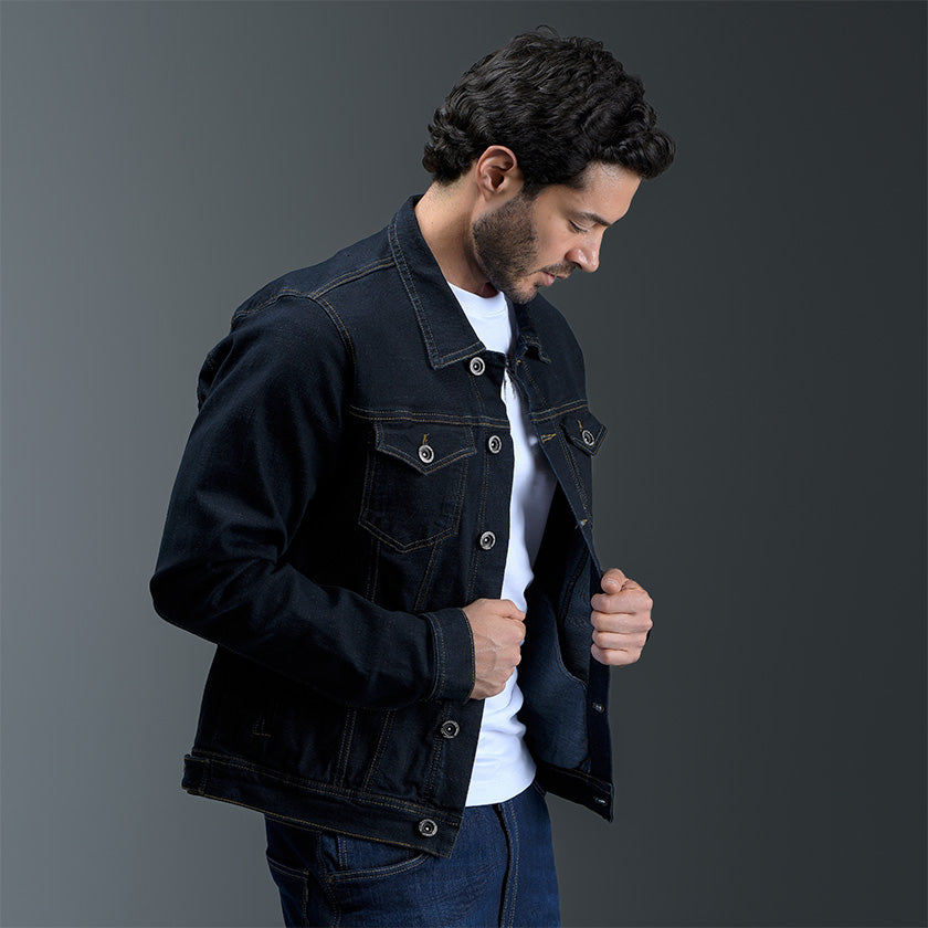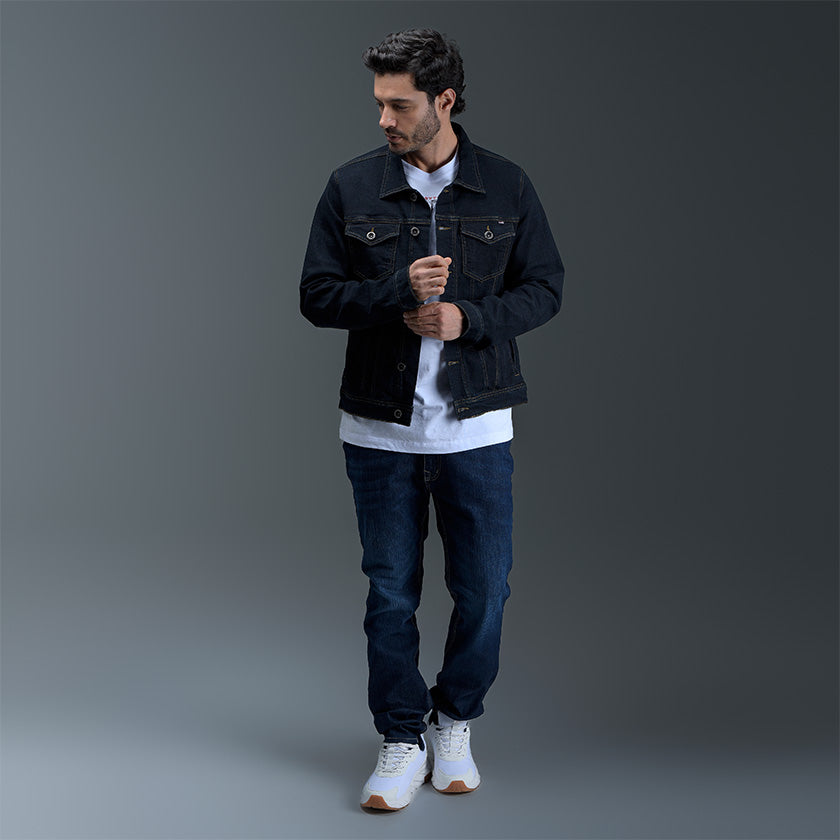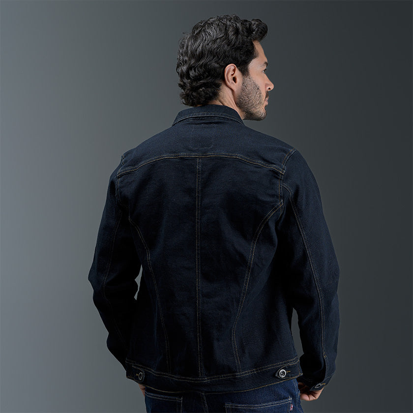 Chaqueta de jean para hombre. Una prenda clásica que nunca pasa de moda, confeccionada en denim resistente para brindar durabilidad y estilo. Presenta bolsillos delanteros de ribete ancho con solapa y botones metálicos, costuras visibles que destacan el diseño y detalles de la marca ROOTT+CO, incluyendo marquilla en el costado. Ideal para un look casual y versátil.