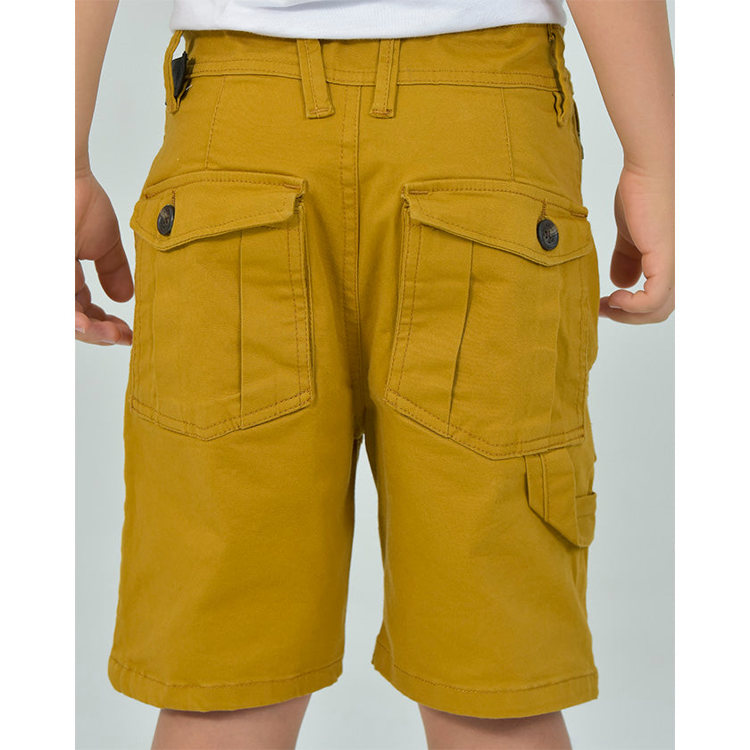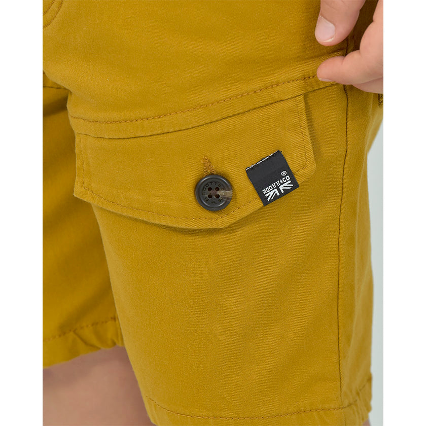 Bermuda cargo para hombre presenta marquilla ROOTT+CO en el bolsillo trasero junto con botón, cómoda ligeramente arriba de la rodilla.