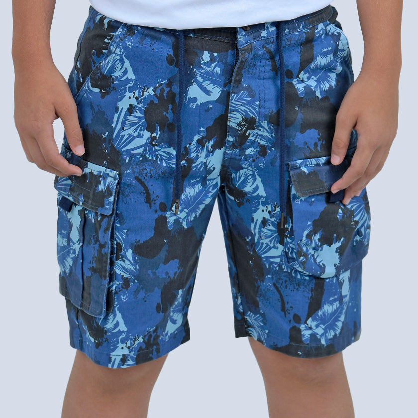 Bermuda cargo para niño presenta bolsillos en los muslos, marquilla ROOTT+CO en el bolsillo trasero, cómoda ligeramente arriba de la rodilla y luce cordones ajustables.
