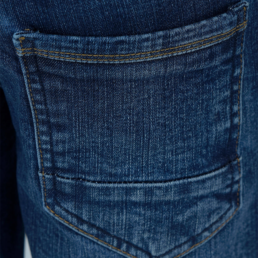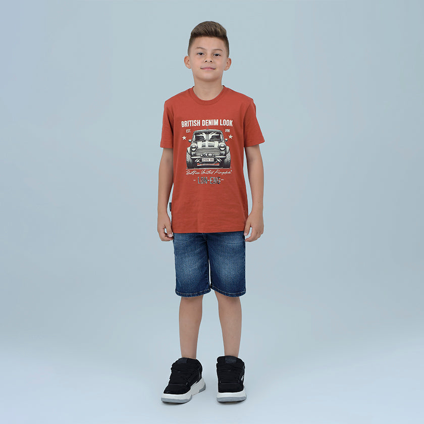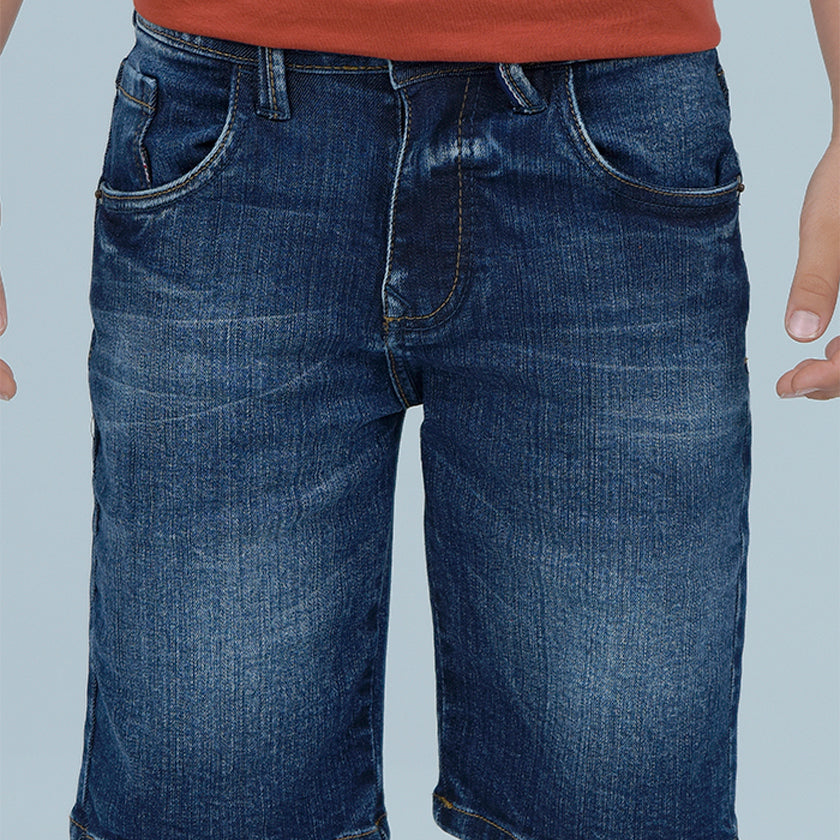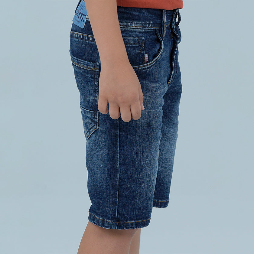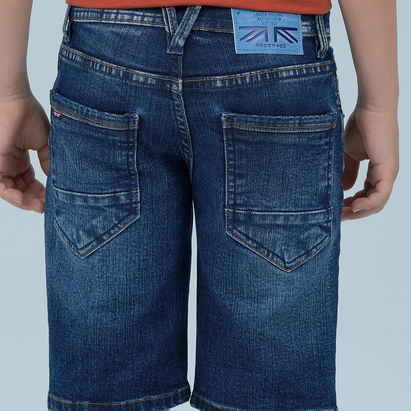 Bermuda denim para niño presenta marquilla ROOTT+CO, cómoda ligeramente arriba de la rodilla.