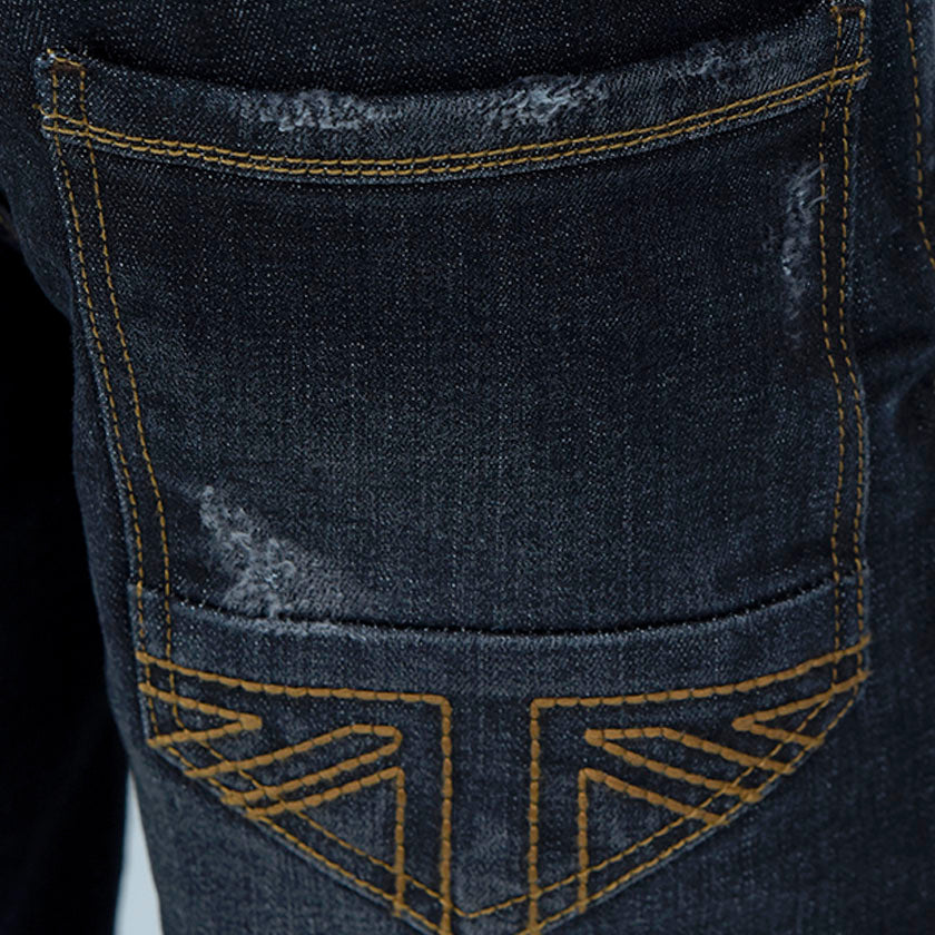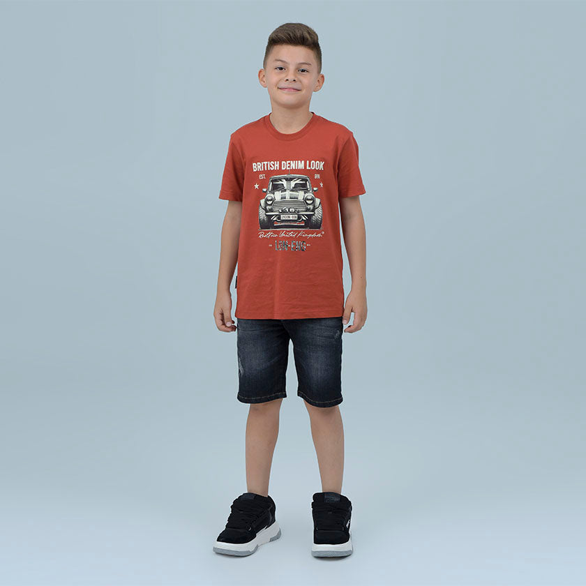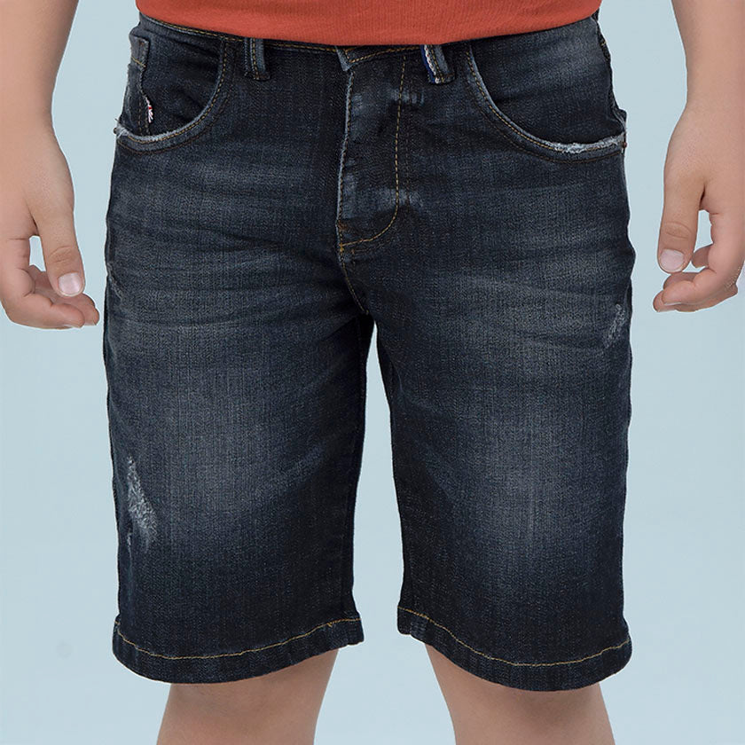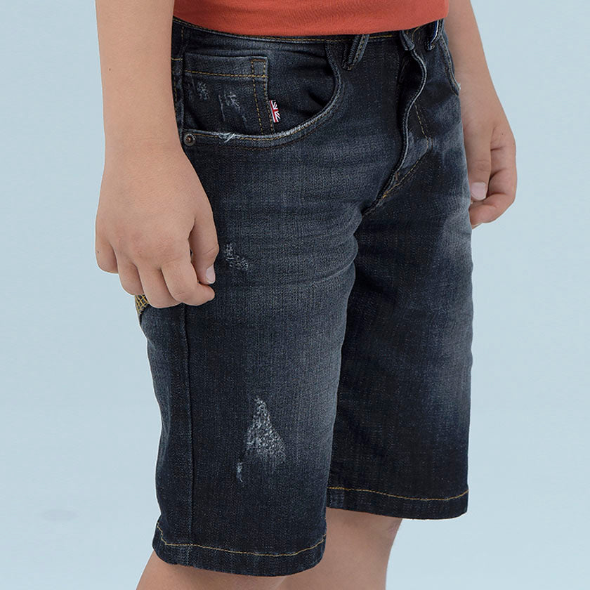 Bermuda denim para niño presenta marquilla ROOTT+CO, cómoda ligeramente arriba de la rodilla.
