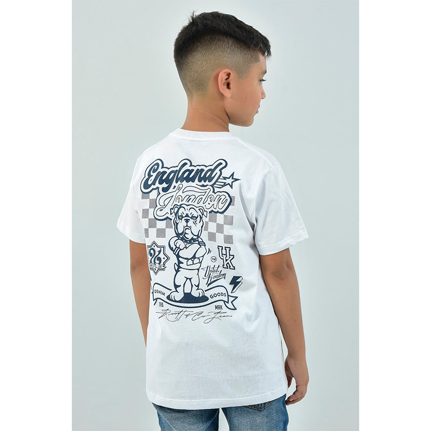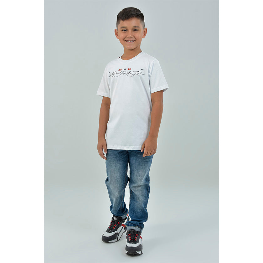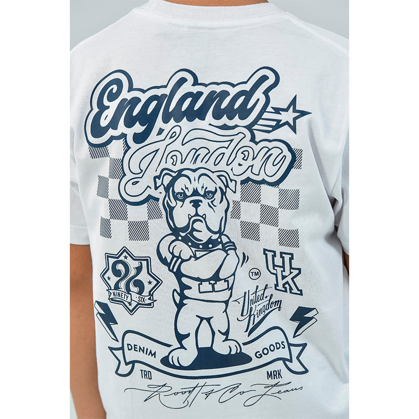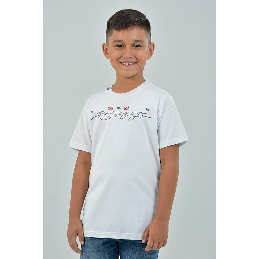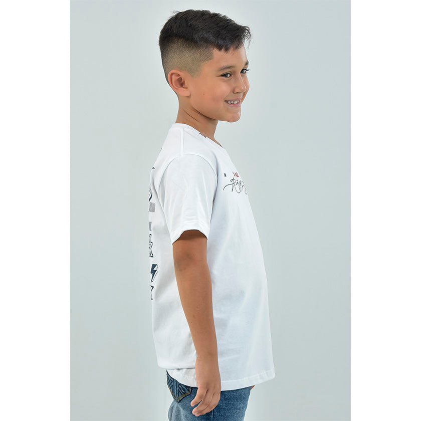 Camiseta niño luce bandera ROOTT+CO estampada en el pecho.