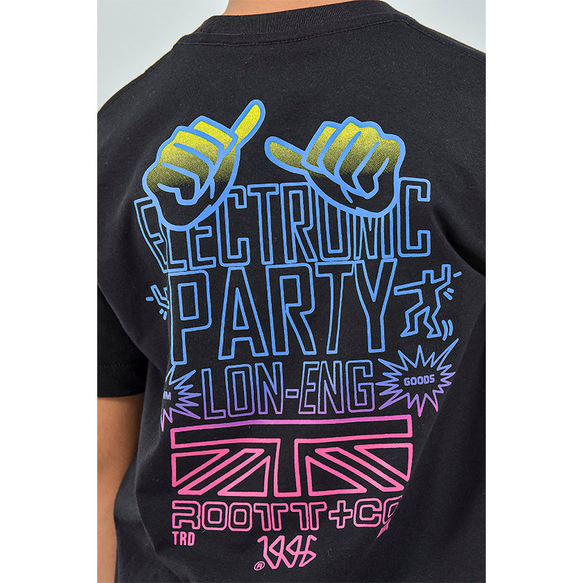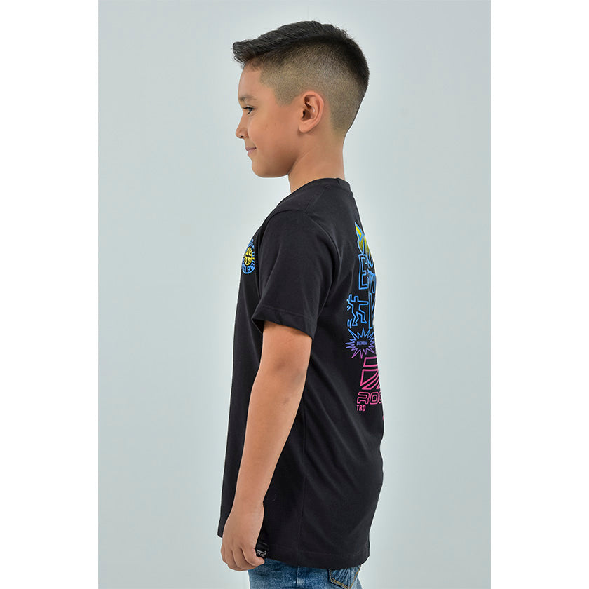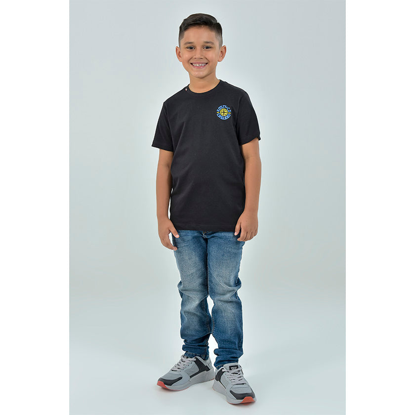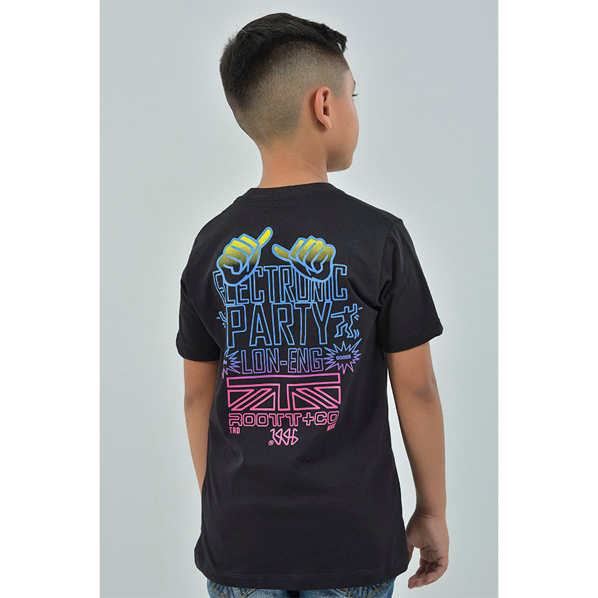 Camiseta niño luce bandera ROOTT+CO estampada en el pecho.