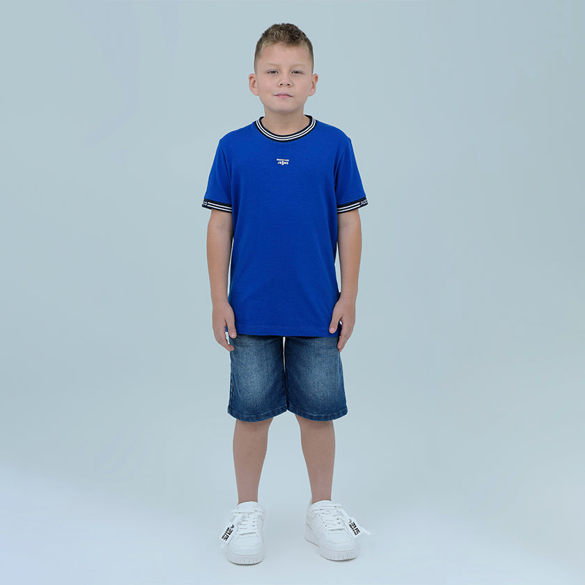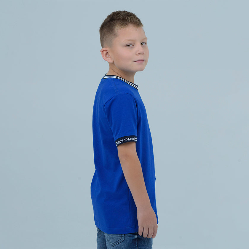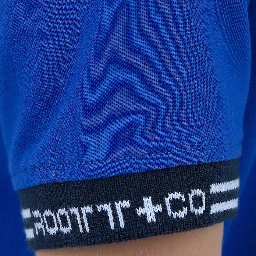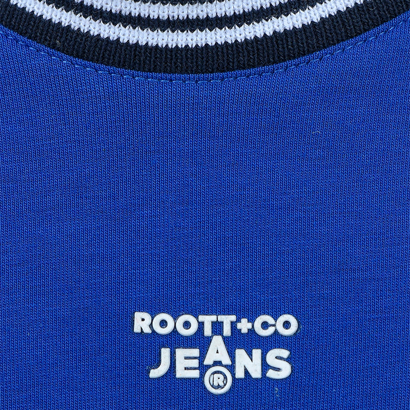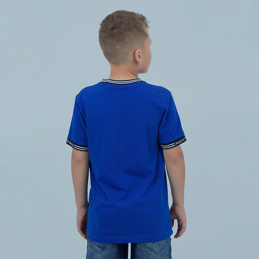 Camiseta Kids presenta logo Roott+co Jeans en el pecho, su cuello y puños tejidos rematan el diseño de la prenda.
