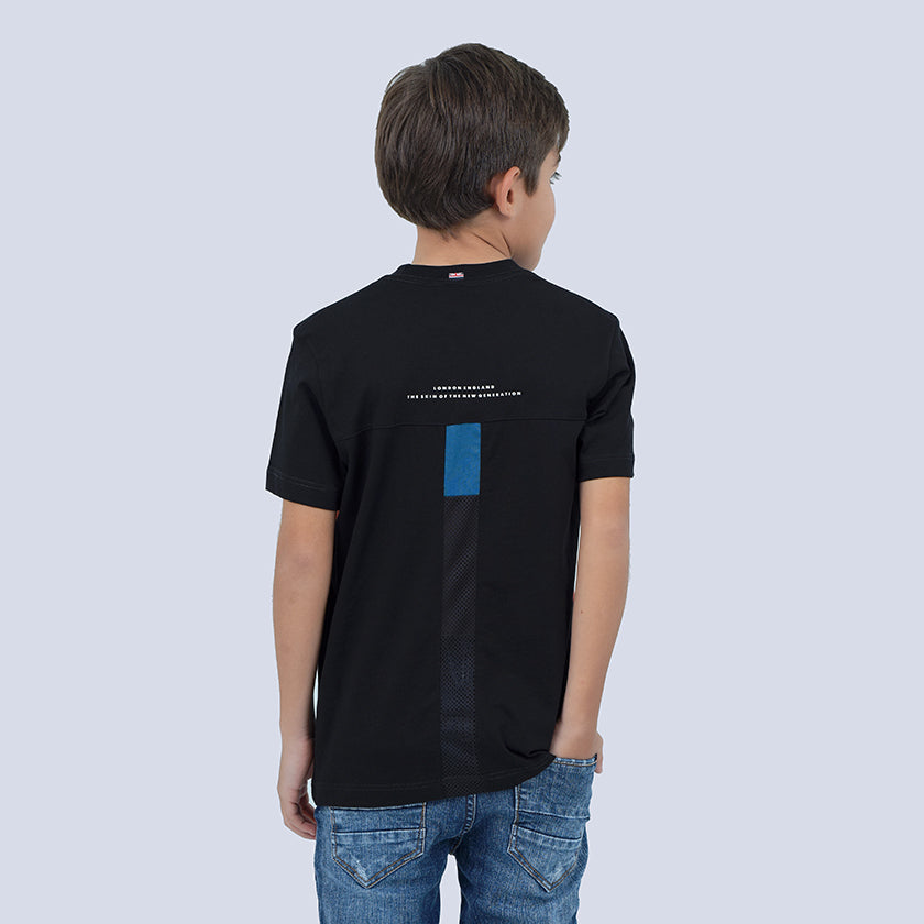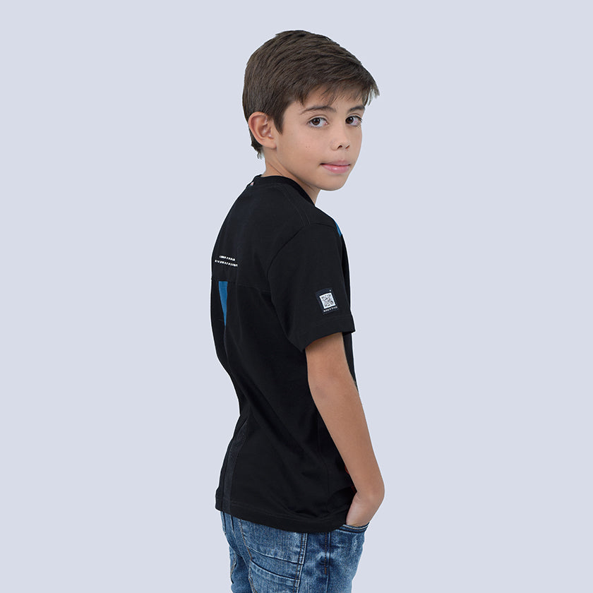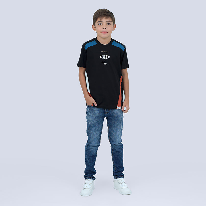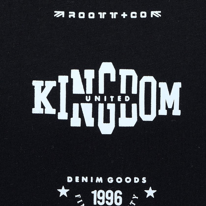 Camiseta Kids presenta gráfico Roott+co en el pecho, presenta marquilla bandera en el cuello posterior, sus cortes laterales en rojo y azul rematan el diseño de la prenda.