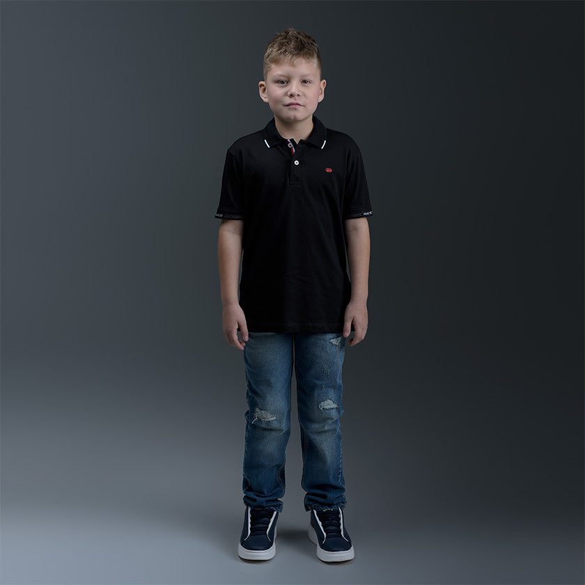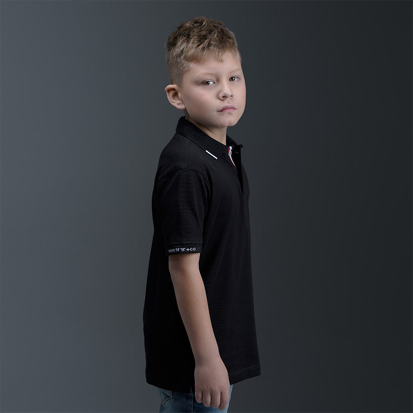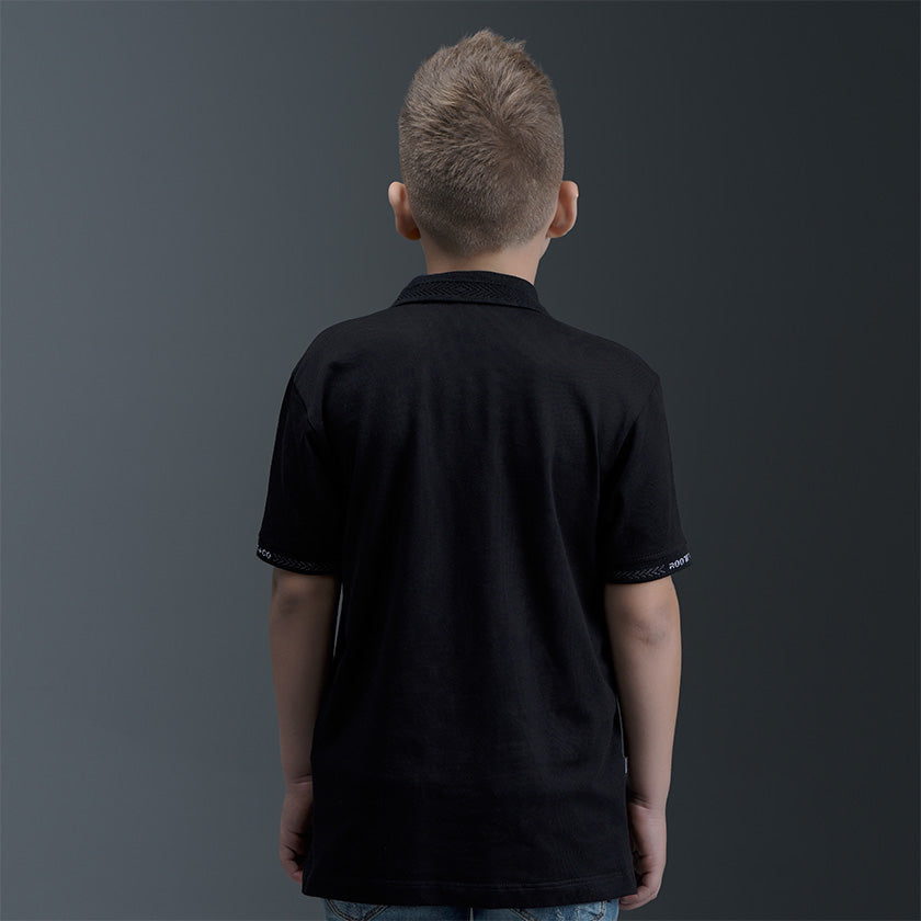 Polo para niño estampado presenta logo ROOTT+CO en el pecho. Los puños y el cuello en punto plano y acanalados le dan un toque elegante.
