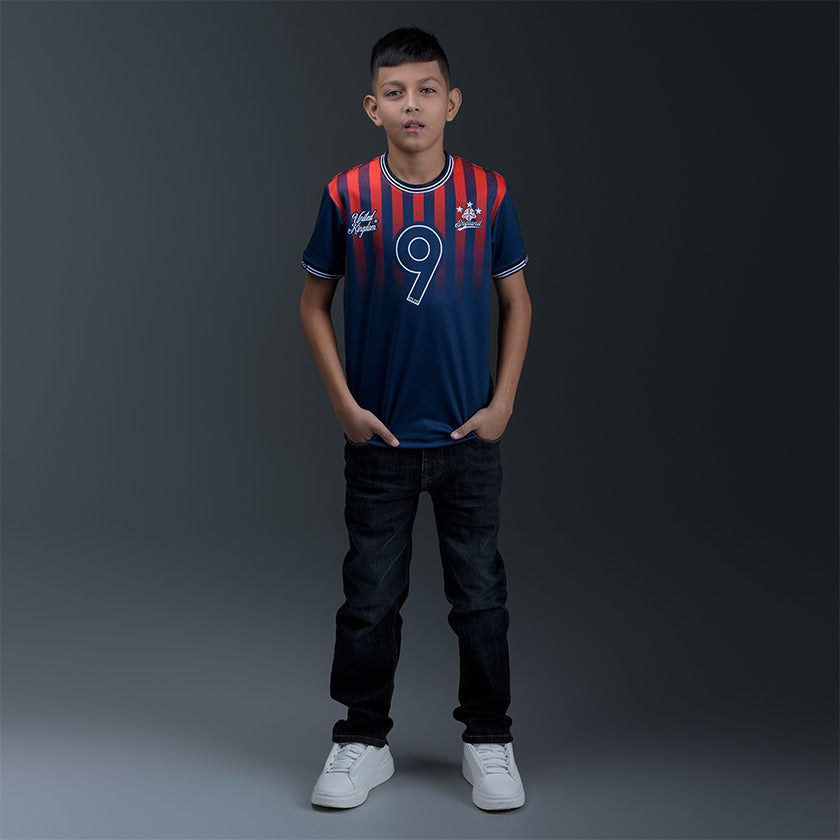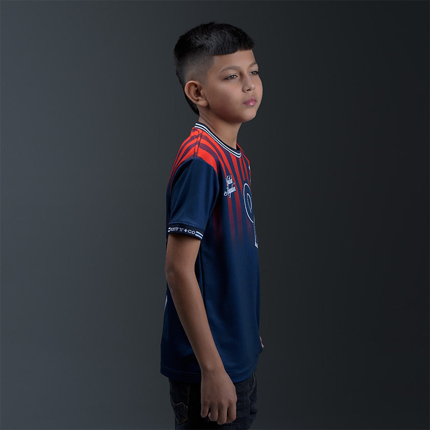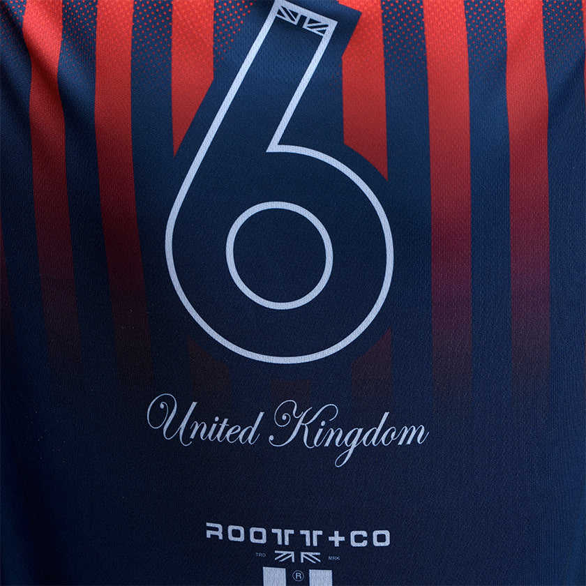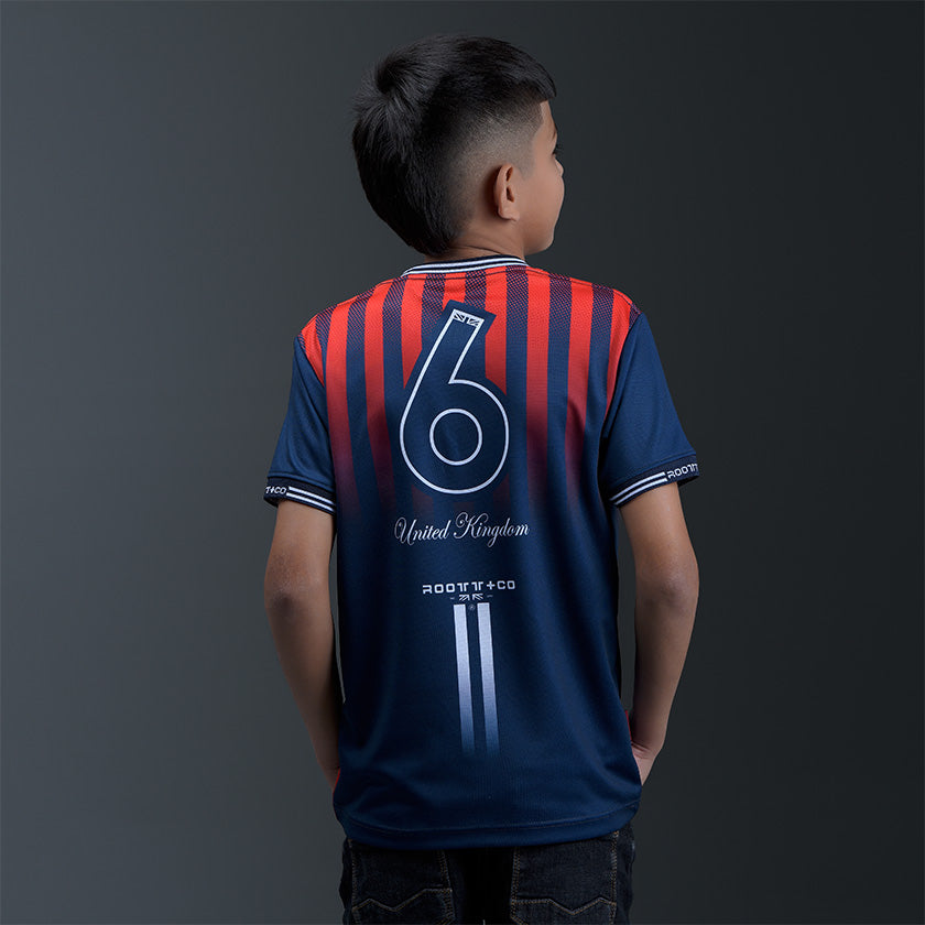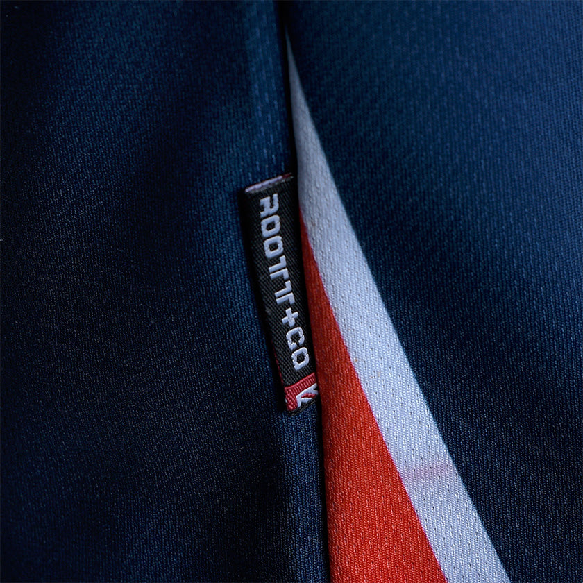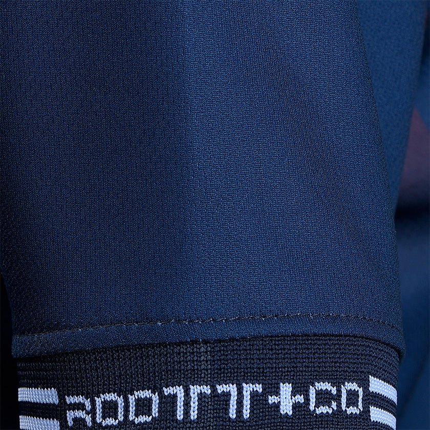 Camiseta Kids presenta gráfico Roott+co en el pecho, presenta marquilla bandera en el cuello posterior, sus cortes laterales en azul rematan el diseño de la prenda.
