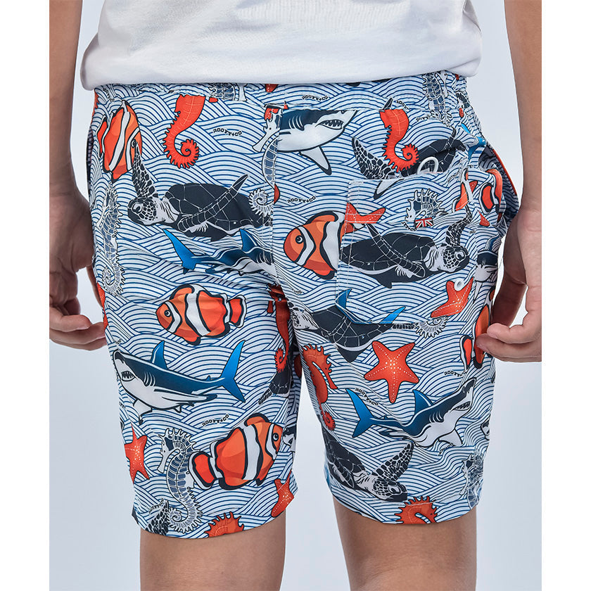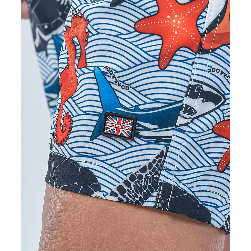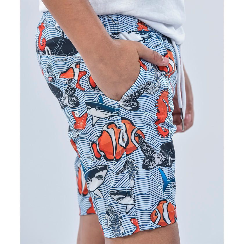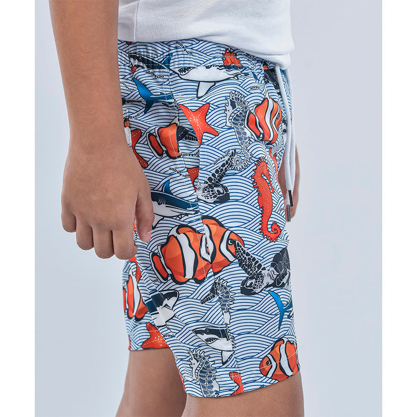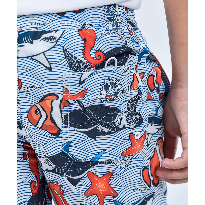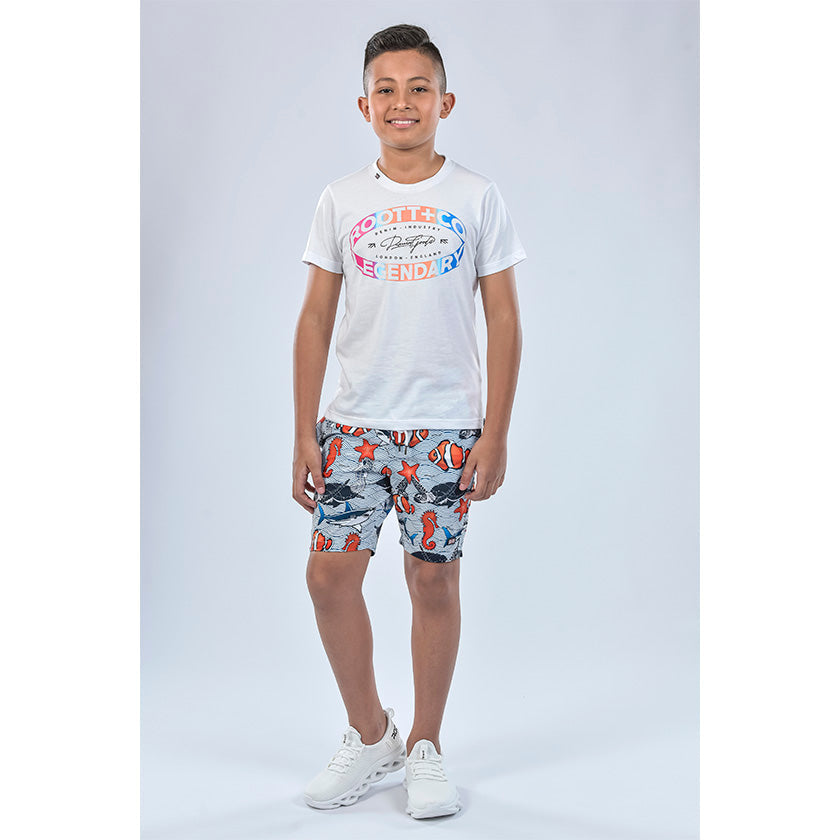 Pantaloneta playera para niño. Presenta el sello ROOTT+CO y la marca bandera en el bolsillo posterior, cómodo ligeramente arriba de la rodilla, luce cordones ajustables.