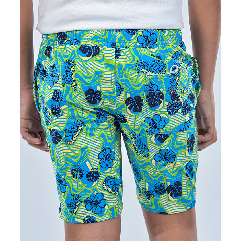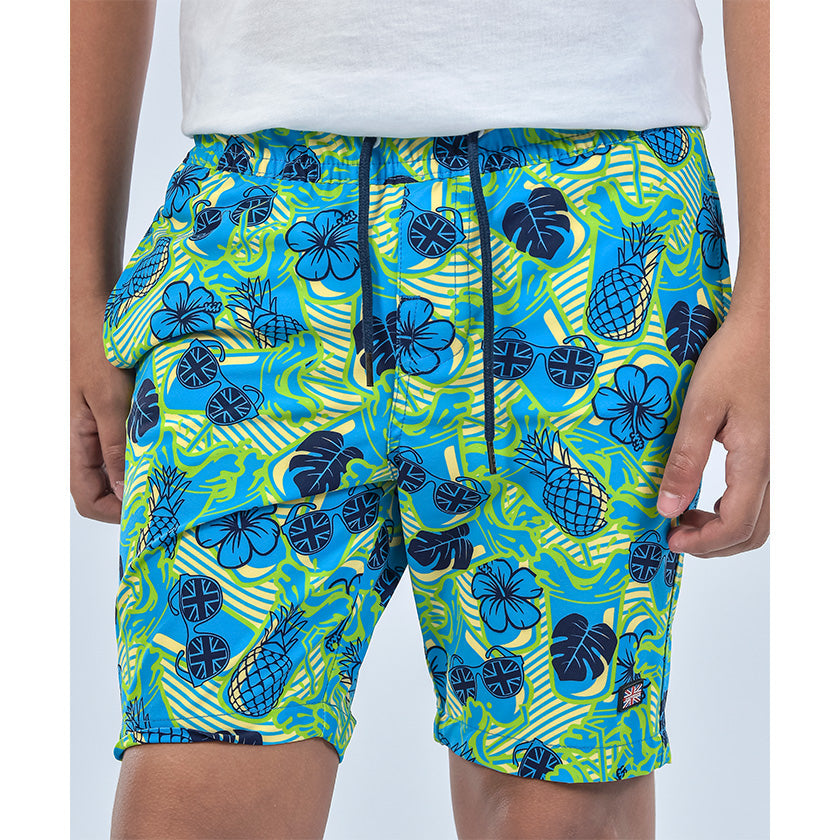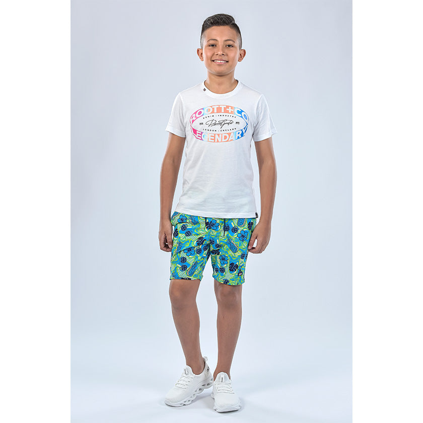 Pantaloneta playera para niño. Presenta el sello ROOTT+CO y la marca bandera en el bolsillo posterior, cómodo ligeramente arriba de la rodilla, luce cordones ajustables.
