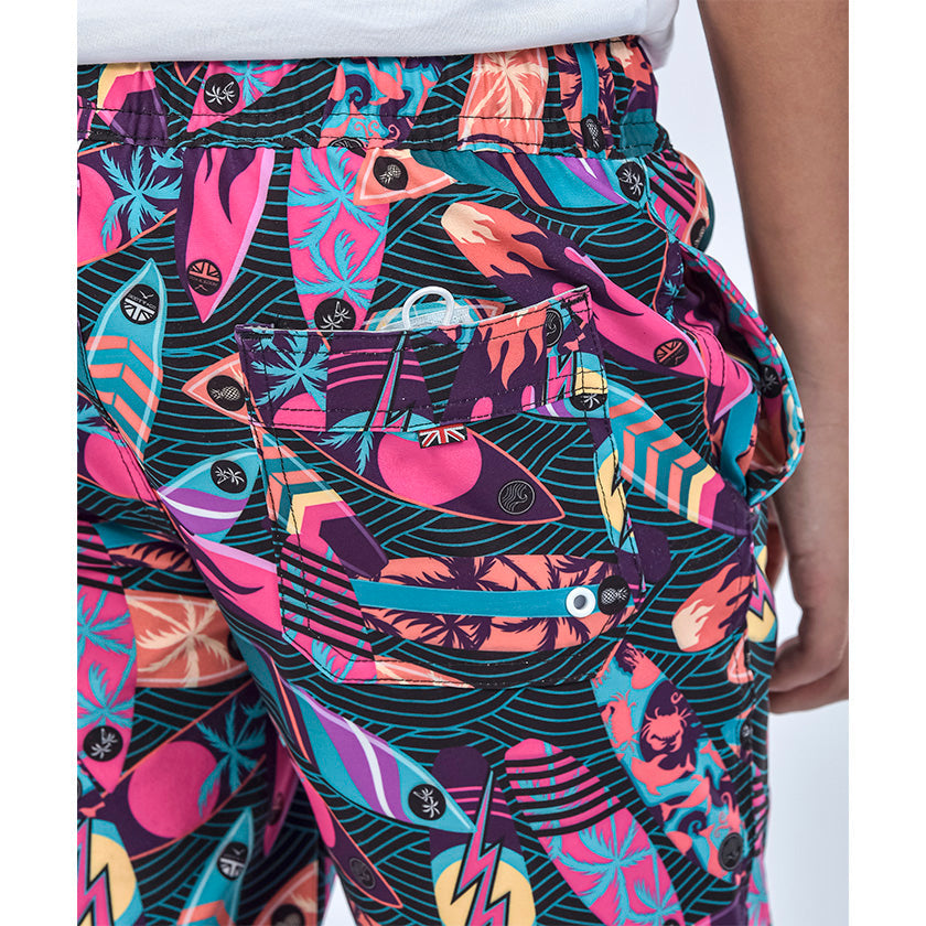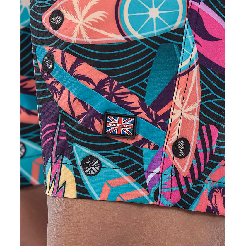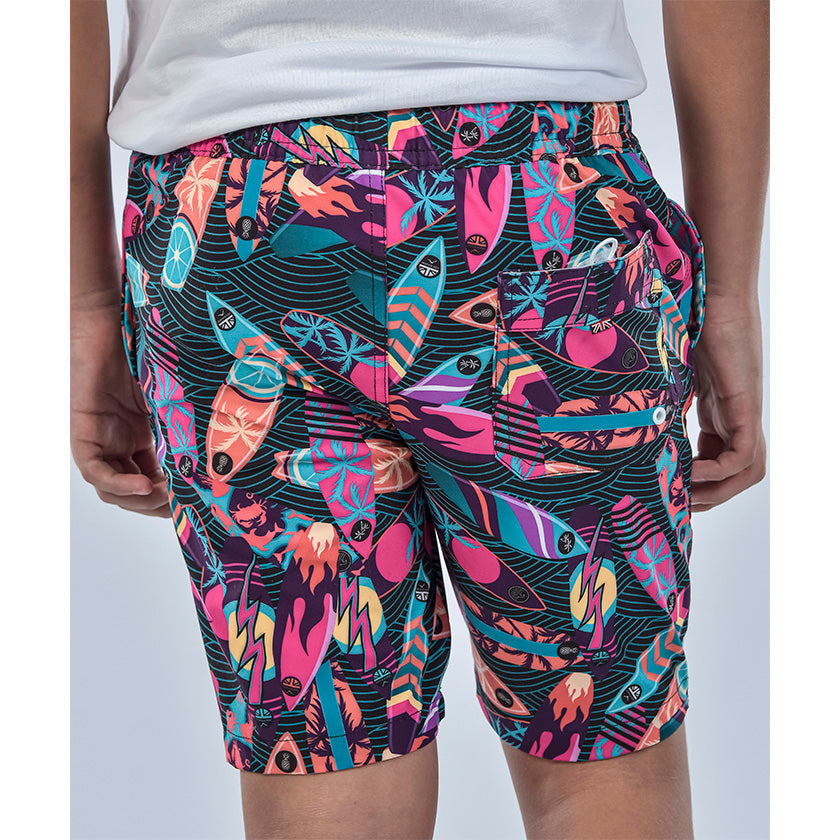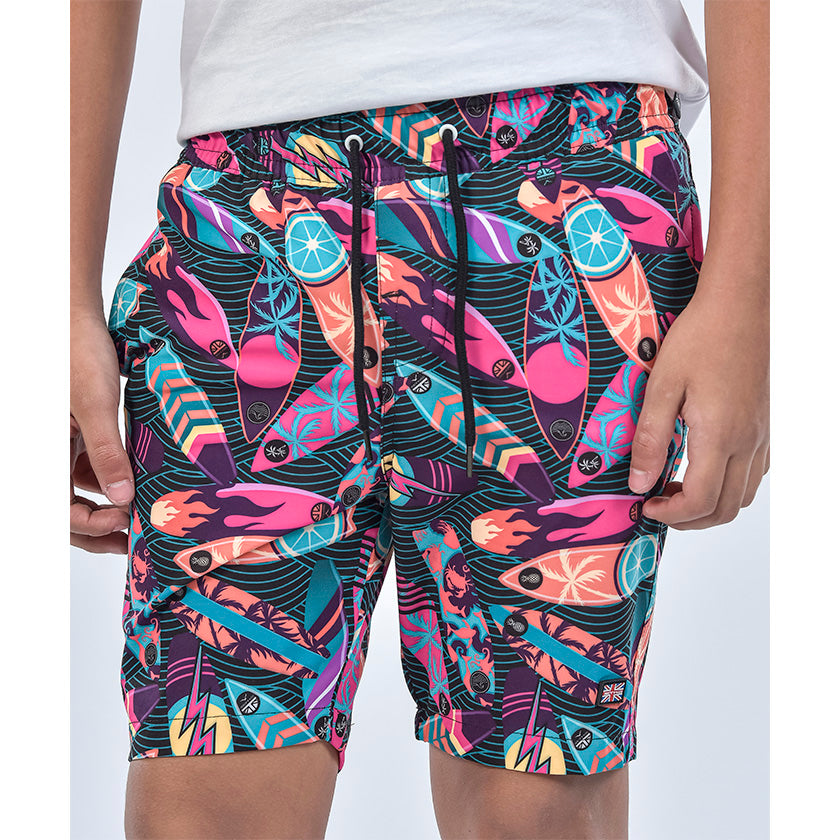Pantaloneta playera para niño. Presenta el sello ROOTT+CO y la marca bandera en el bolsillo posterior, cómodo ligeramente arriba de la rodilla, luce cordones ajustables.