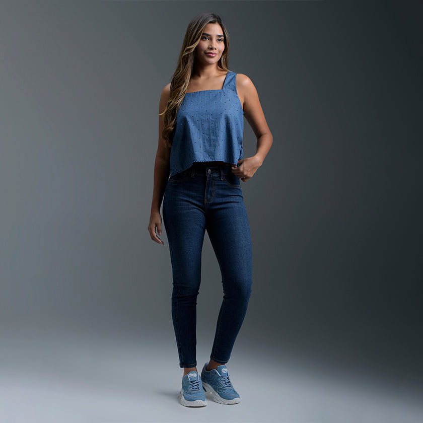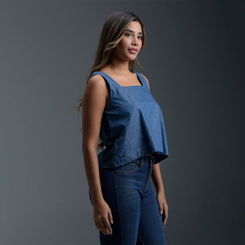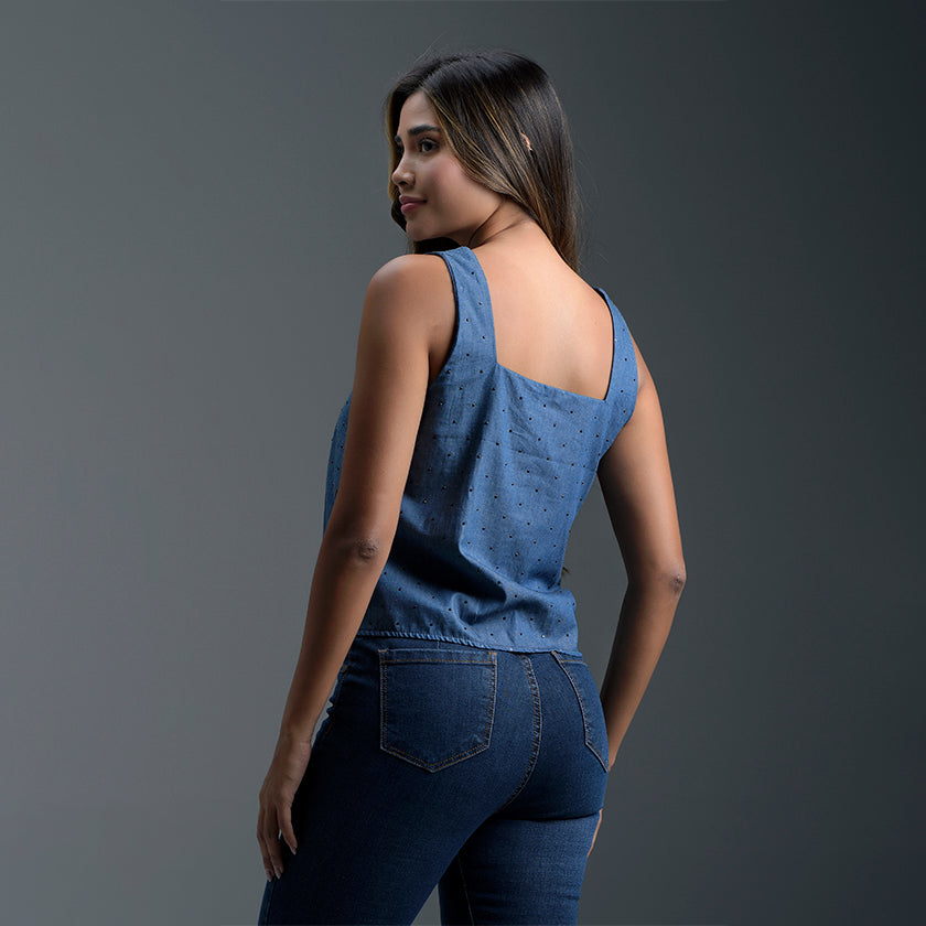 Blusa denim manga sisa presenta un diseño llamativo este detalle resalta la espalda de manera elegante, dejando un espacio descubierto que aporta frescura y estilo, también incluye un pequeño corte en la parte inferior central, realzando la originalidad del diseño y permitiendo mayor comodidad al vestir.