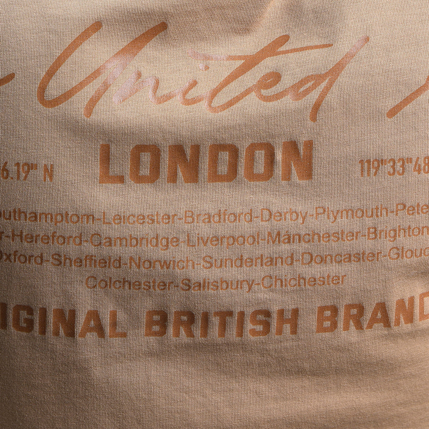 Confeccionada en una tela suave al tacto, presenta un corte recto y mangas cortas que aportan frescura y libertad de movimiento. En el frente destaca un detalle sutil del logo bordado, mientras que en la parte posterior incorpora una estampación tipográfica con inspiración británica, que realza su estilo contemporáneo y distintivo.