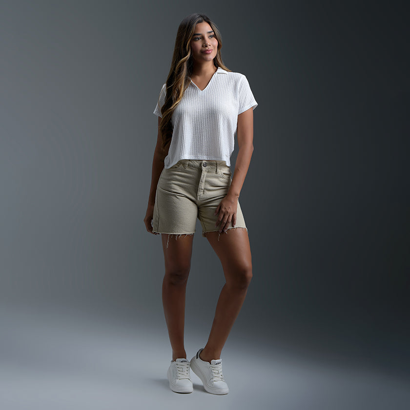 Camisa manga corta para mujer combina frescura y comodidad en un diseño moderno y sofisticado. Su corte bajo realiza la silueta de forma sutil. El bajo ligeramente redondeado le da un acabado femenino y versátil, perfecto para eventos casuales, reuniones o salidas elegantes bajo el sol.
