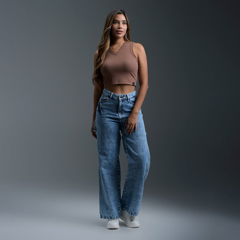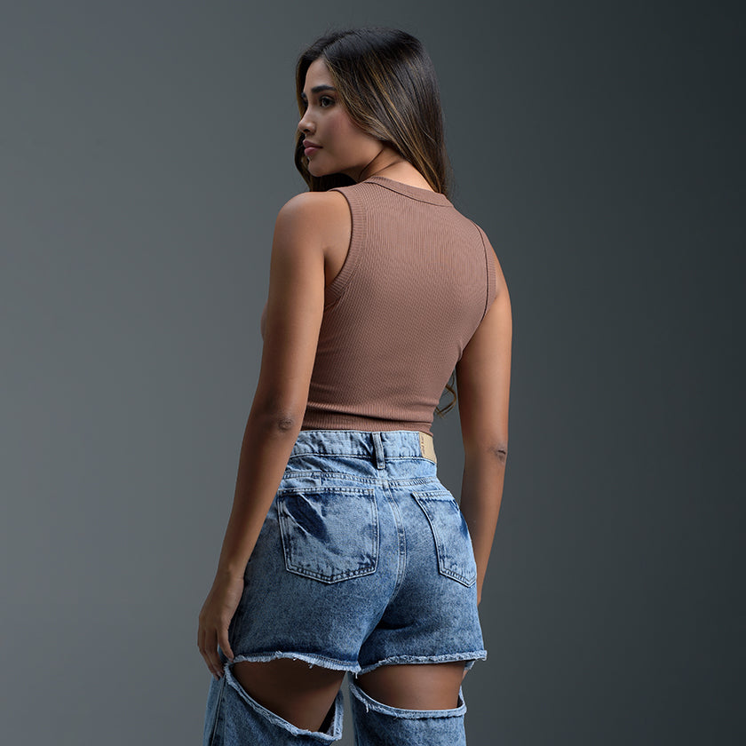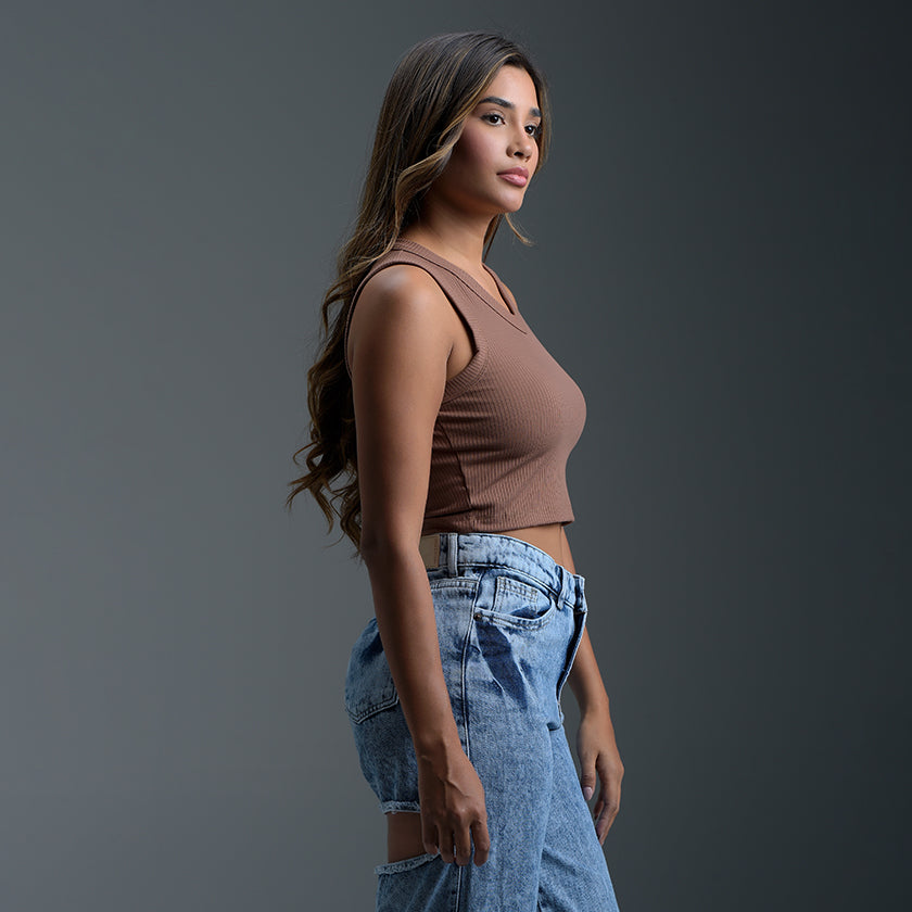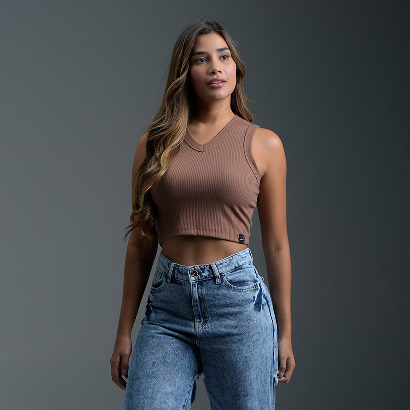 Adopta un look minimalista y chic con esta blusa crop top sin mangas. Diseñada para la comodidad y el estilo, esta pieza esencial presenta un corte ajustado y luce un toque moderno y versátil. El escote redondo simple en la parte delantera y el escote en espalda redondeado rematan el diseño de la prenda, ofreciendo una silueta limpia y contemporánea.