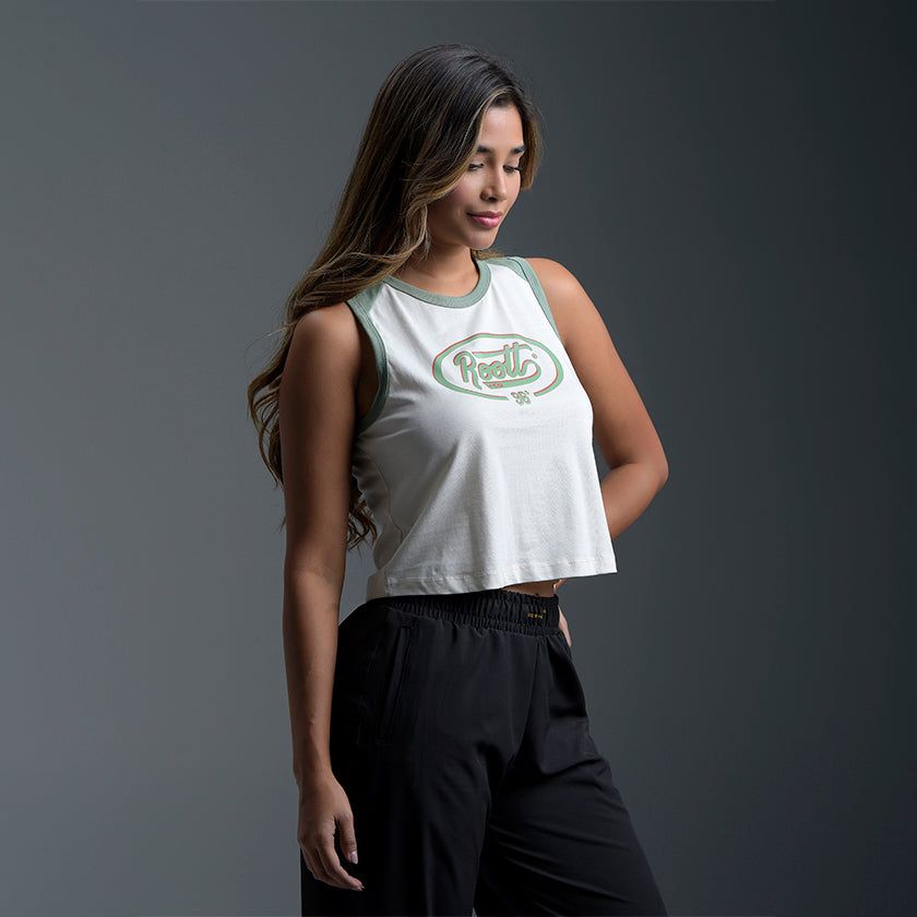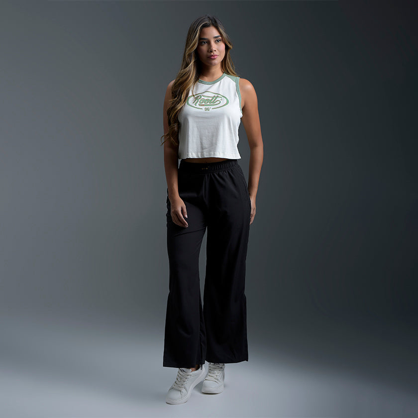 Este top cropped de tirantes combina un estilo vintage deportivo con un diseño moderno. Es la pieza perfecta para un look relajado de verano o para combinar con pantalones de cintura alta.