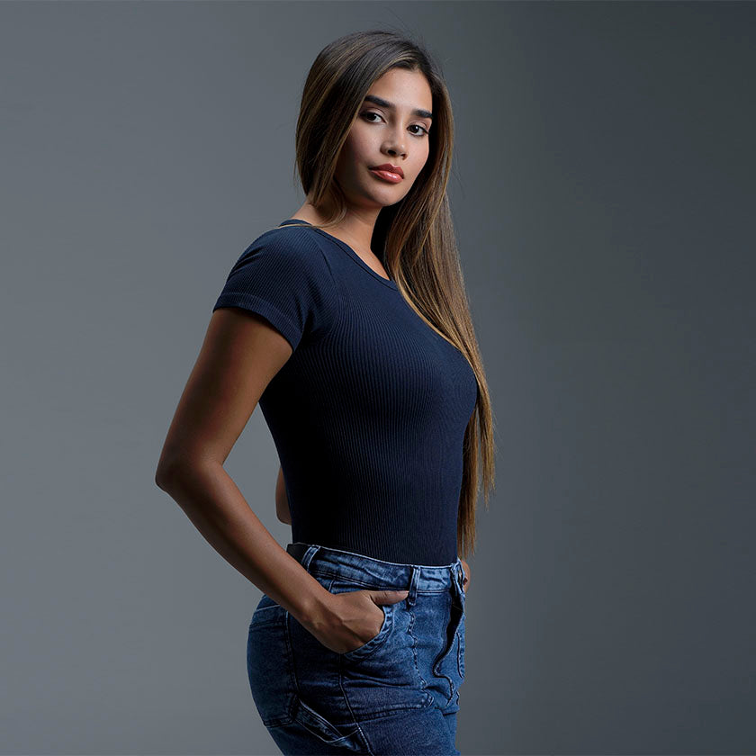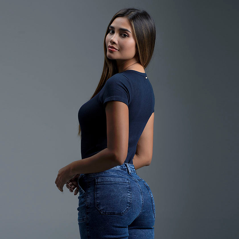 Body azul de estilo casual con diseño tipo buzo y tejido acanalado que se ajusta suavemente al cuerpo. Confeccionado en material elástico y cómodo, ofrece un look moderno y favorecedor. Presenta cuello redondo y mangas cortas, perfecto para combinar con jeans o faldas y crear outfits versátiles para cualquier ocasión