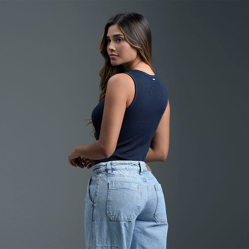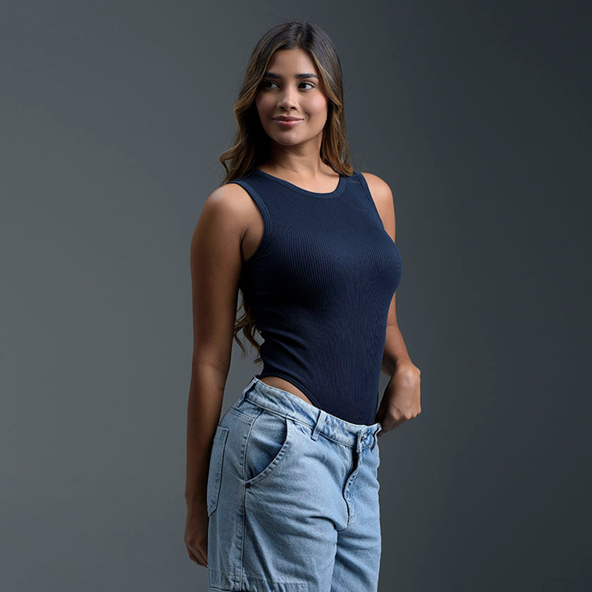 Body azul sin mangas elaborado en tejido acanalado que se ajusta al cuerpo con comodidad y estilo. Su diseño de cuello redondo y silueta ceñida realza la figura, ofreciendo un look moderno y versátil. Perfecto para combinar con jeans, shorts o faldas y crear atuendos casuales o más sofisticados.