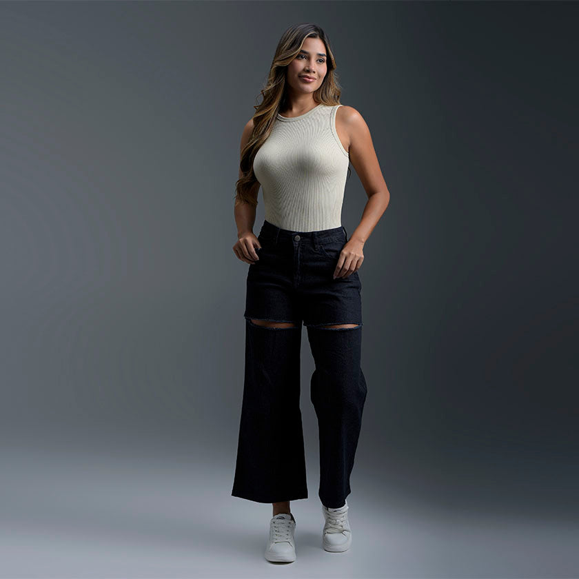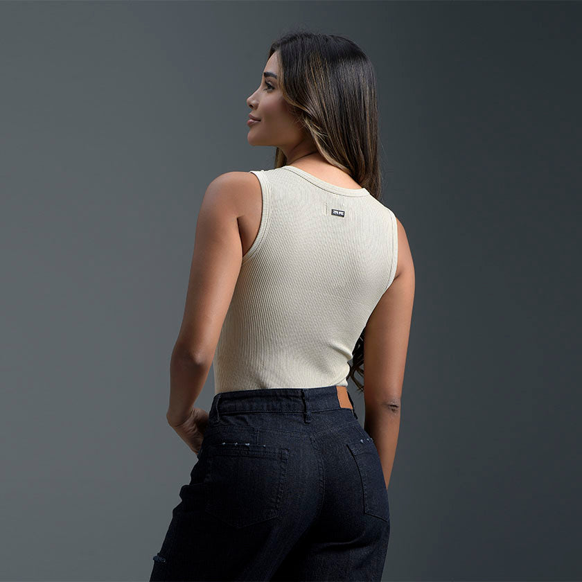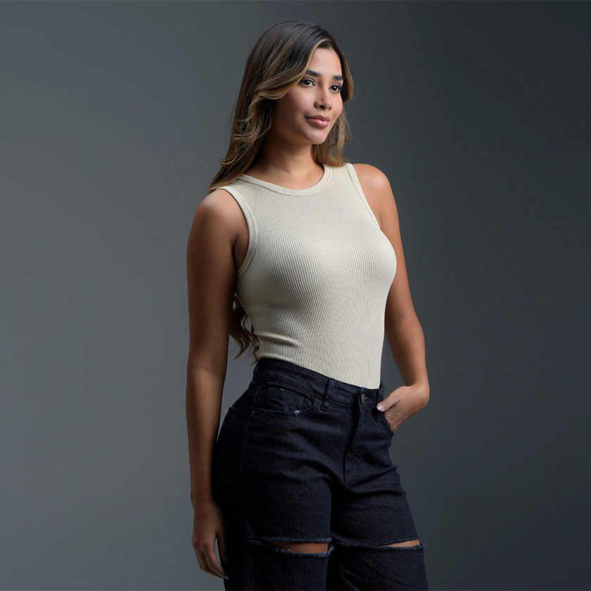 Body sin mangas elaborado en tejido acanalado que se ajusta al cuerpo con comodidad y estilo. Su diseño de cuello redondo y silueta ceñida realza la figura, ofreciendo un look moderno y versátil. Perfecto para combinar con jeans, shorts o faldas y crear atuendos casuales o más sofisticados.