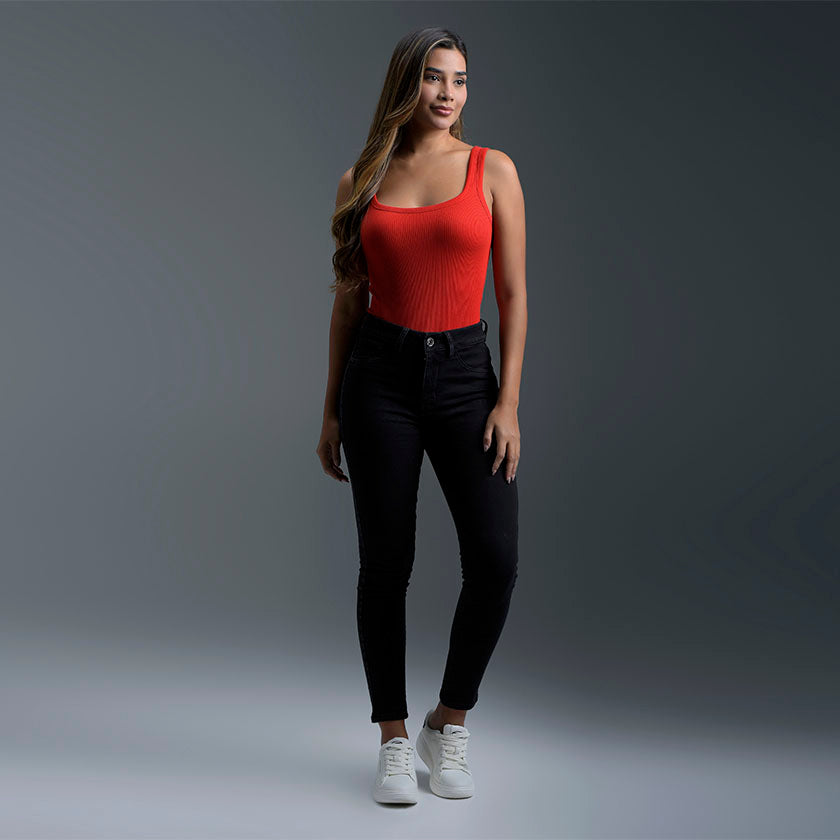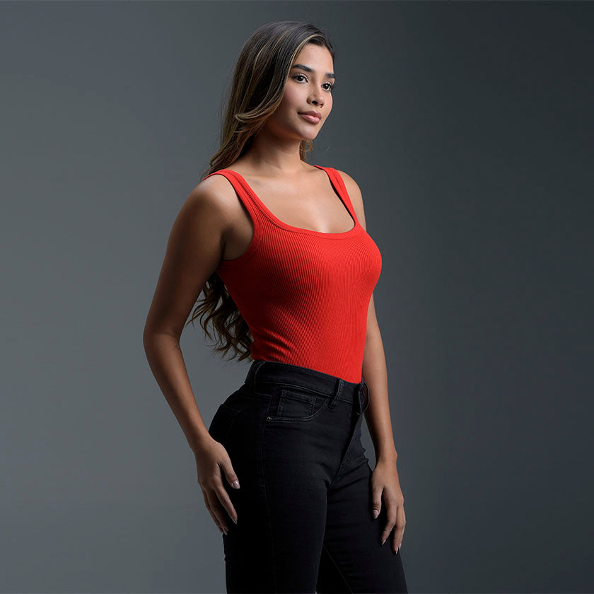 Body rojo sin mangas elaborado en tejido acanalado que se ajusta al cuerpo con comodidad y estilo. Su diseño de cuello redondo y silueta ceñida realza la figura, ofreciendo un look moderno y versátil. Perfecto para combinar con jeans, shorts o faldas y crear atuendos casuales o más sofisticados.
