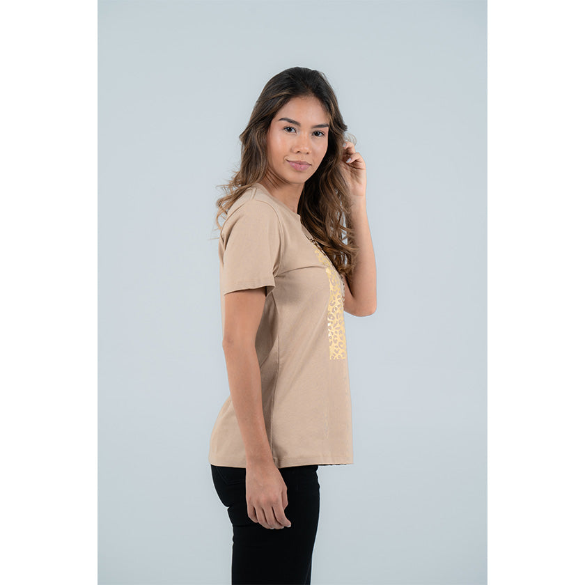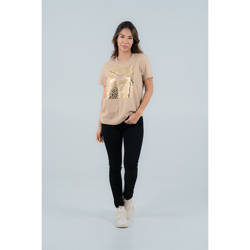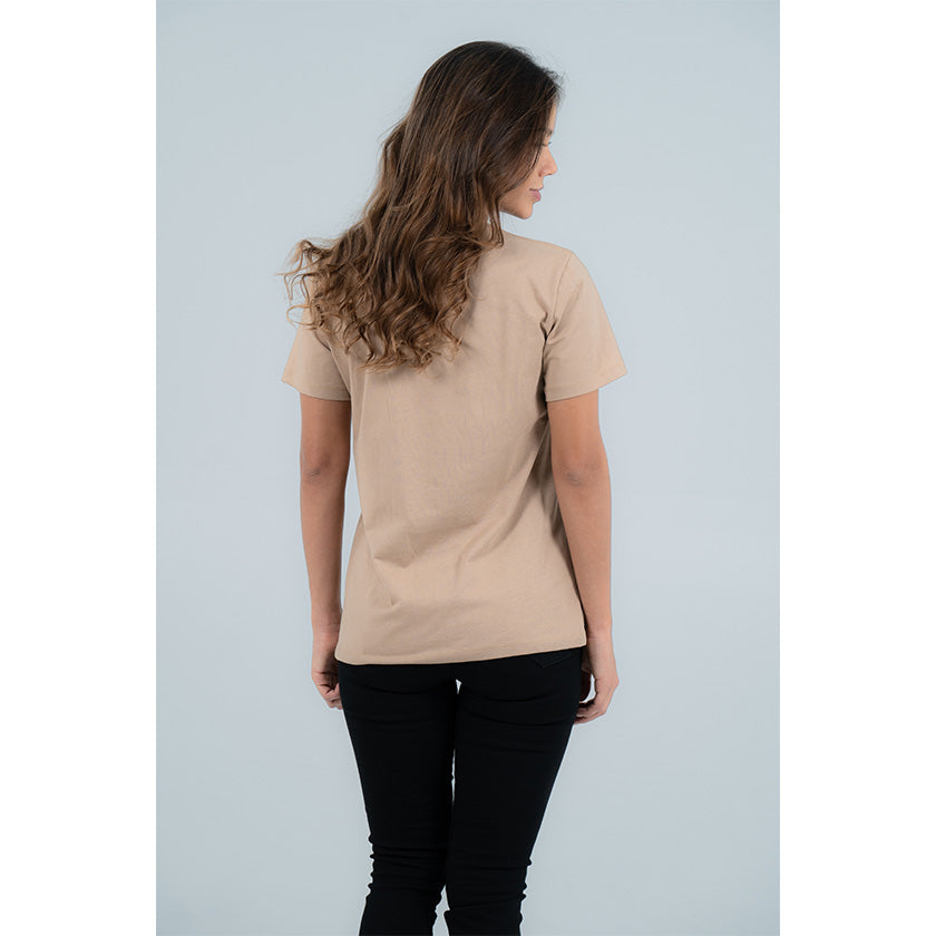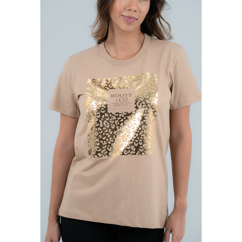 Camiseta para mujer luce un estampado gráfico ROOTT+CO en la parte del pecho.