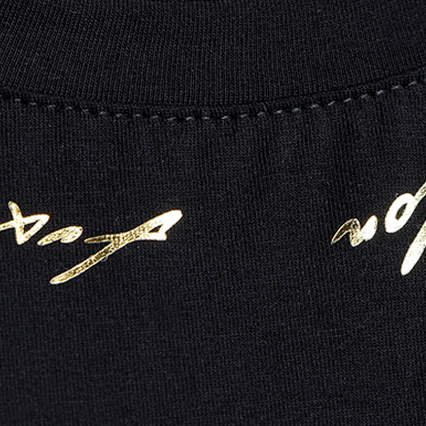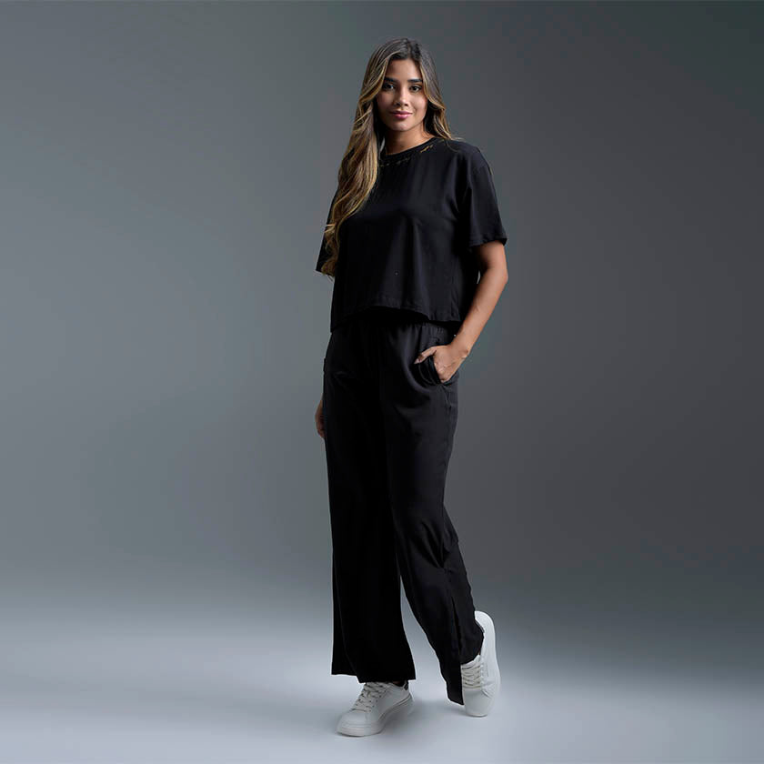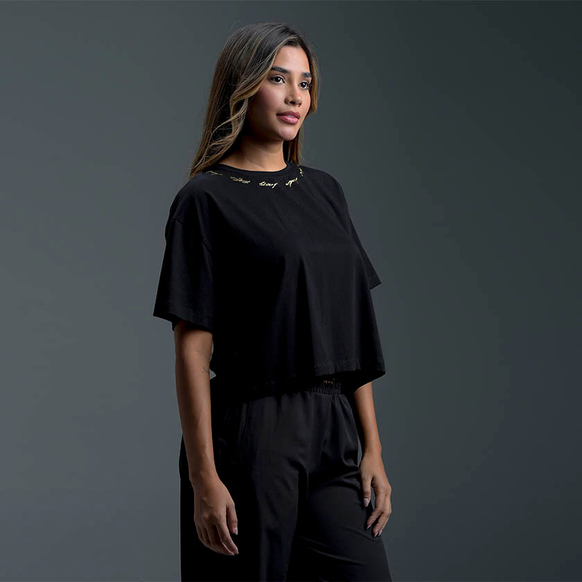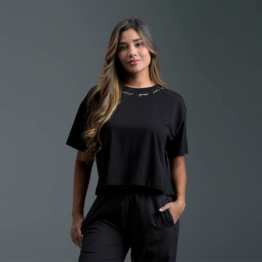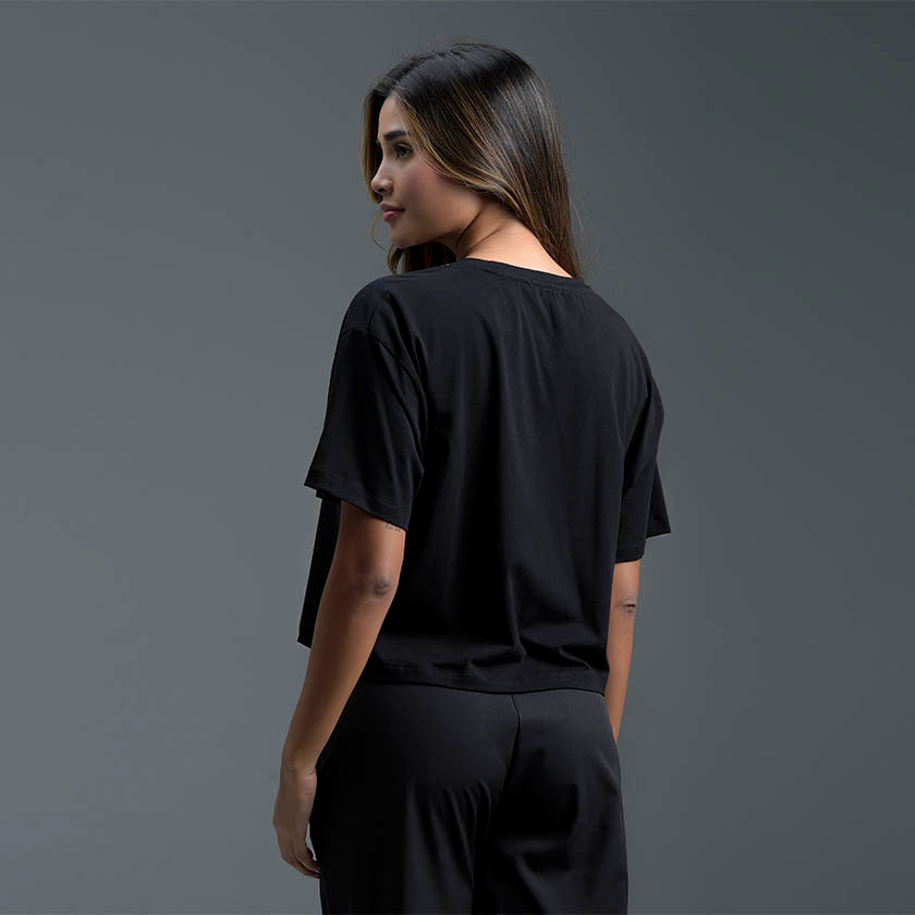 Camiseta para mujer luce gráficos estampados ROOTT+CO en la parte del pecho.