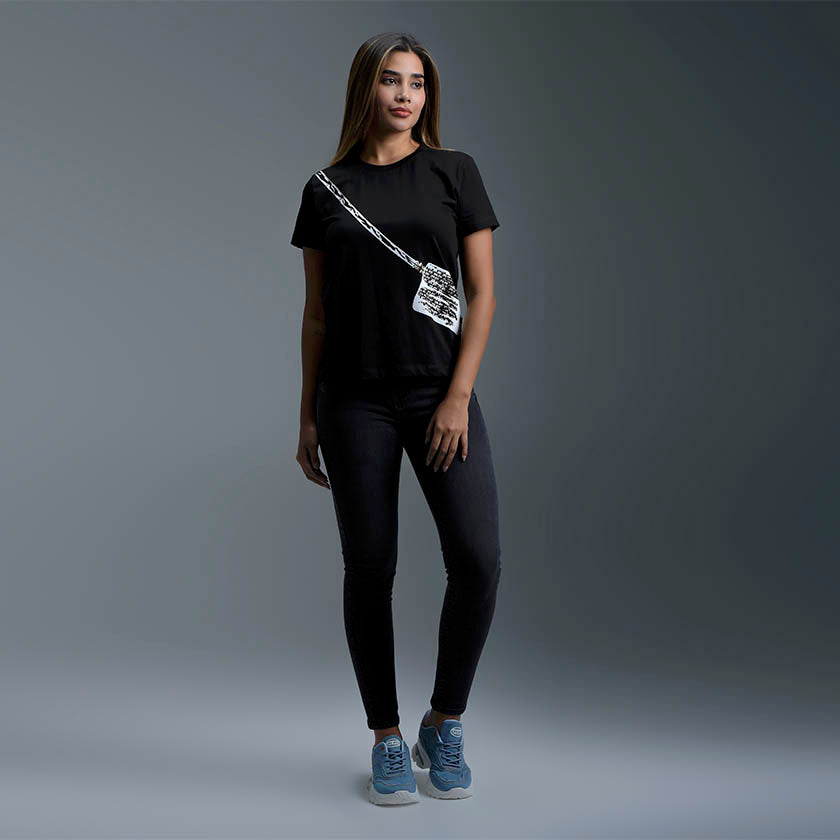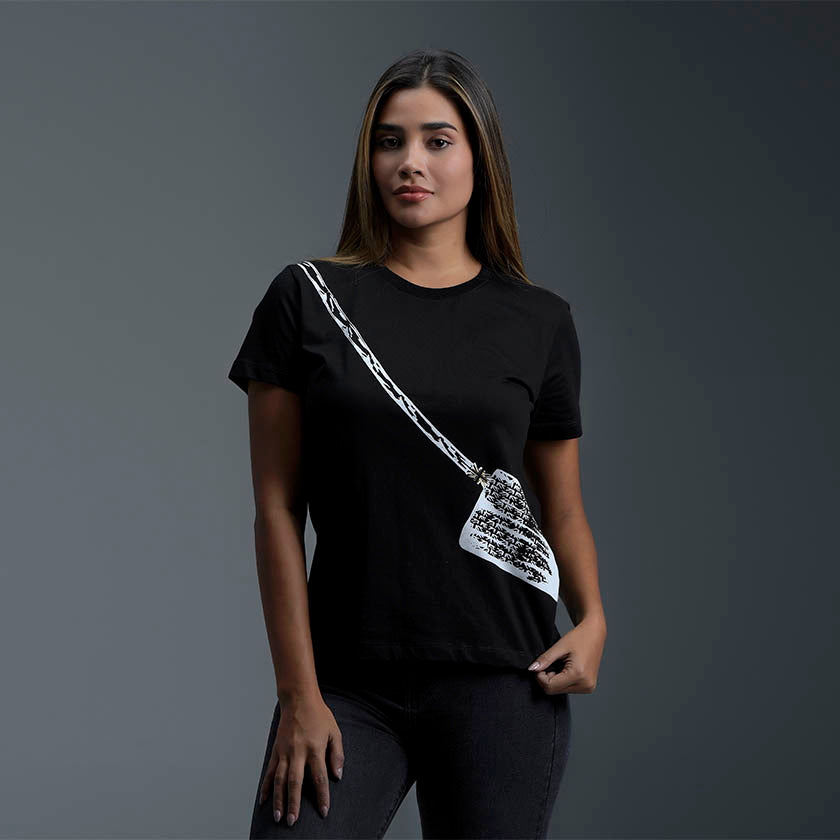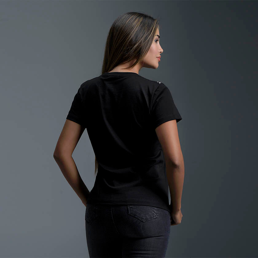 Camiseta para mujer luce un estampado gráfico ROOTT+CO en el pecho. Presenta marquillas de la marca.