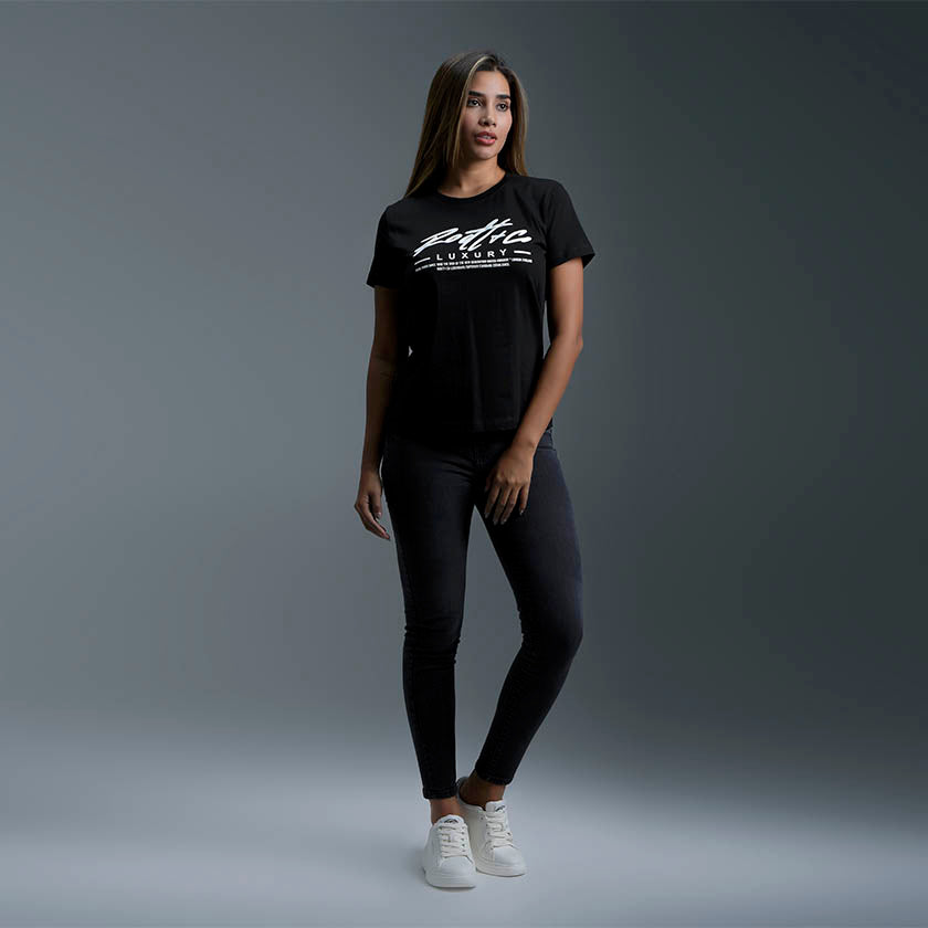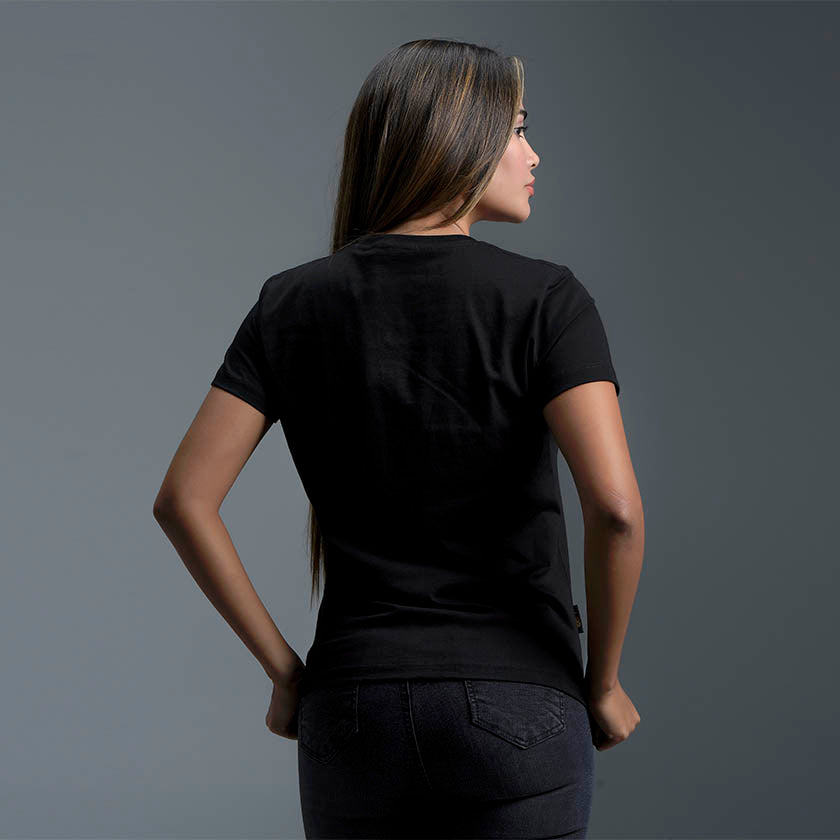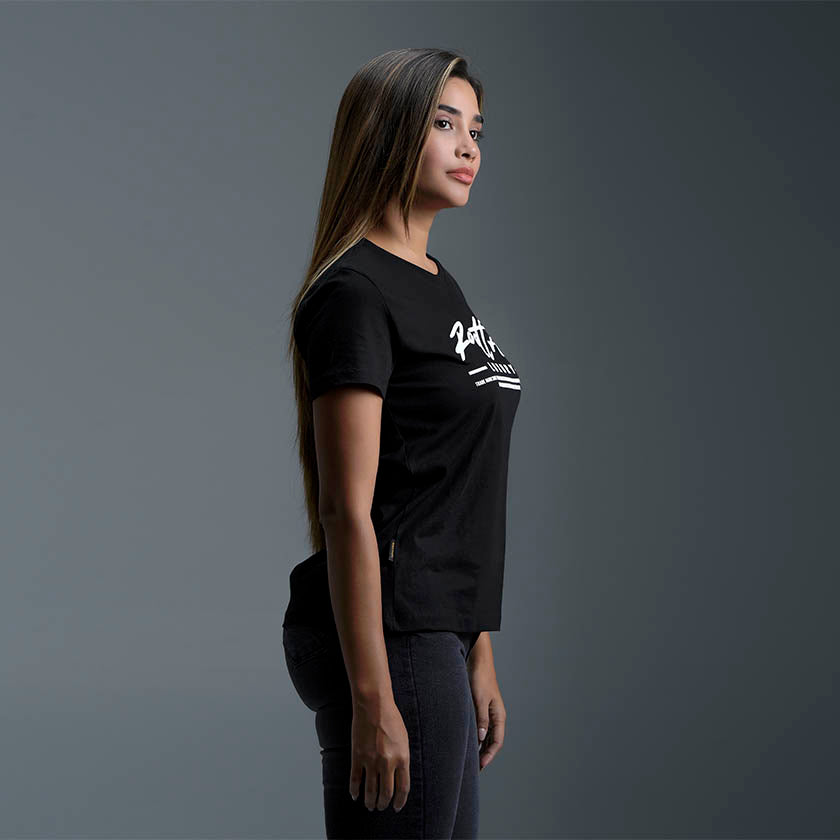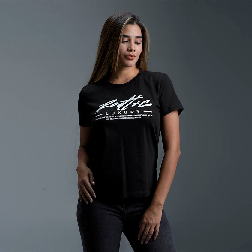 Camiseta para mujer luce un estampado gráfico ROOTT+CO en el pecho. Presenta marquillas de la marca.