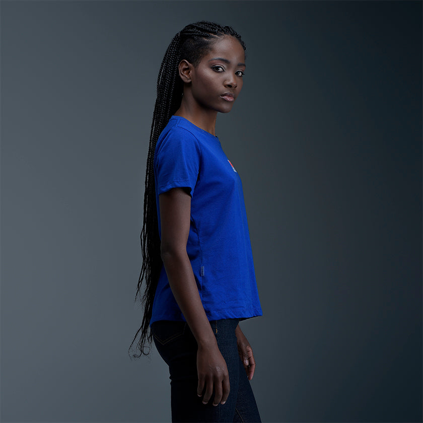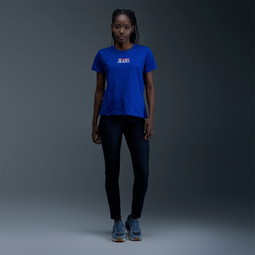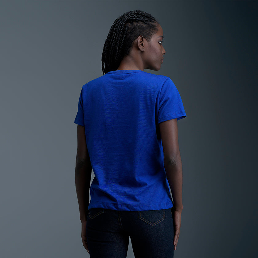 Camiseta para mujer luce un estampado gráfico ROOTT+CO en el pecho. Presenta marquillas de la marca.