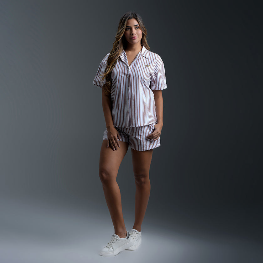Camisa manga corta para mujer combina frescura y comodidad en un diseño moderno y sofisticado. Su corte bajo realza la silueta de forma sutil, mientras que las líneas verticales tricolor añaden un toque distintivo. El bajo ligeramente redondeado le da un acabado femenino y versátil, perfecto para eventos casuales, reuniones o salidas elegantes bajo el sol.