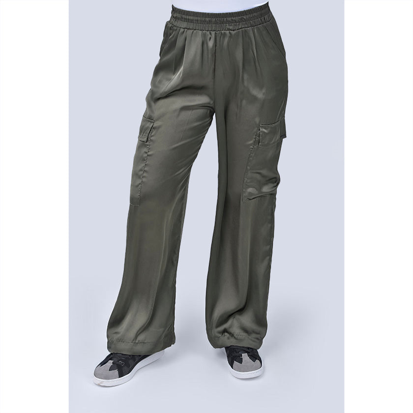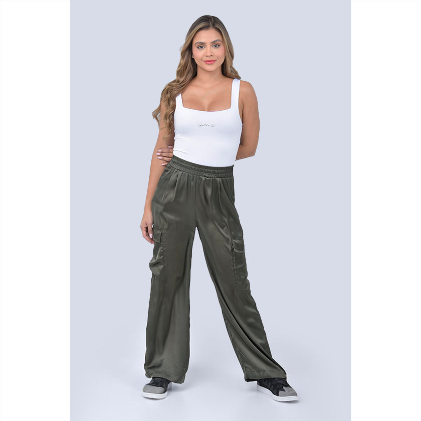 Pantalón para mujer. Presenta una silueta holgada y cordones para ajustar en la parte inferior, siendo más amplia en la pierna y bota. Llevan elásticos que se ajustan en la cinturilla, presenta bolsillos en los muslos y cordones para amarre en los tobillos.