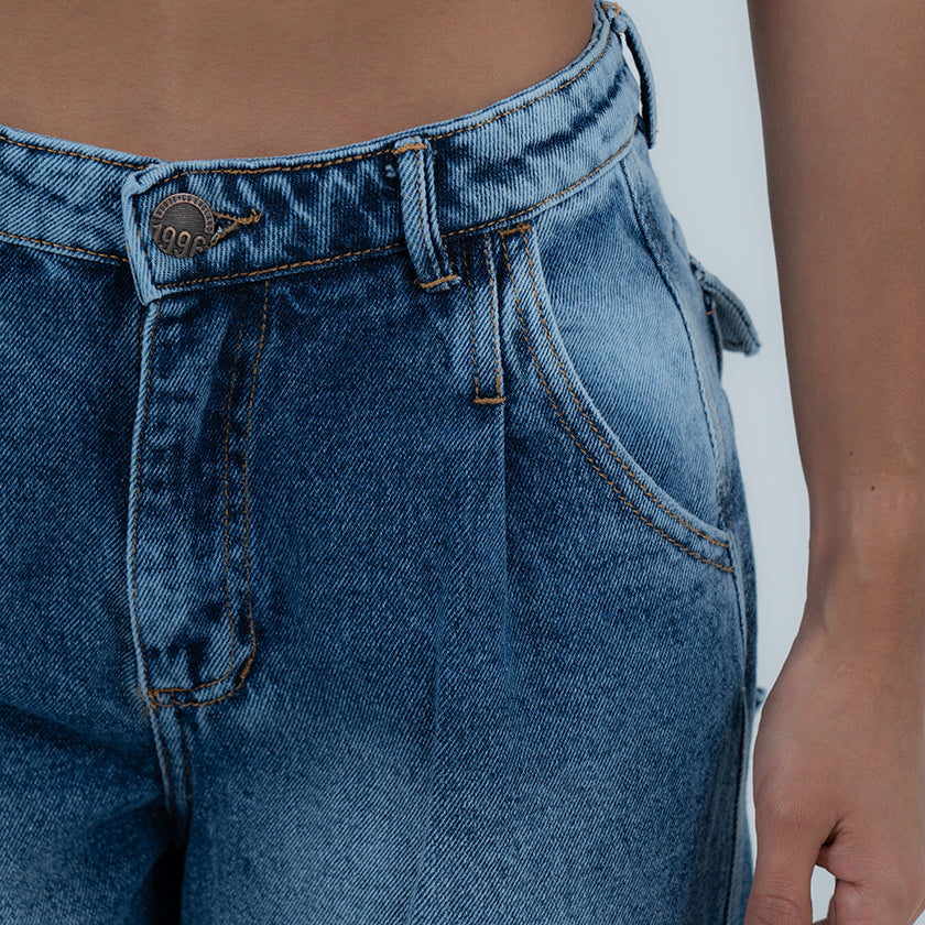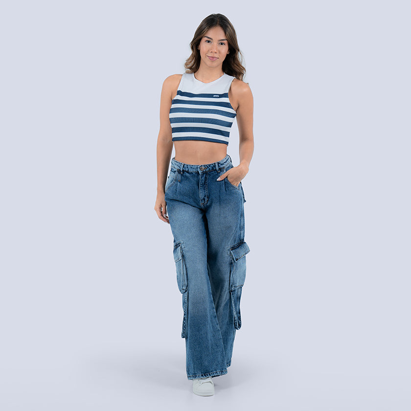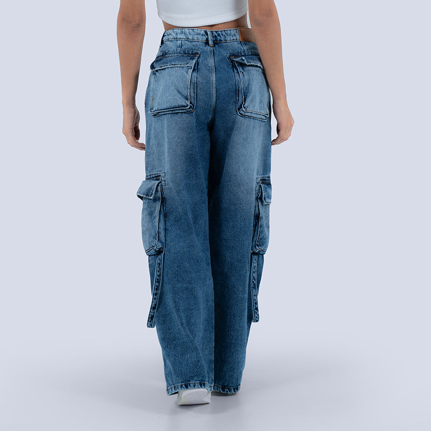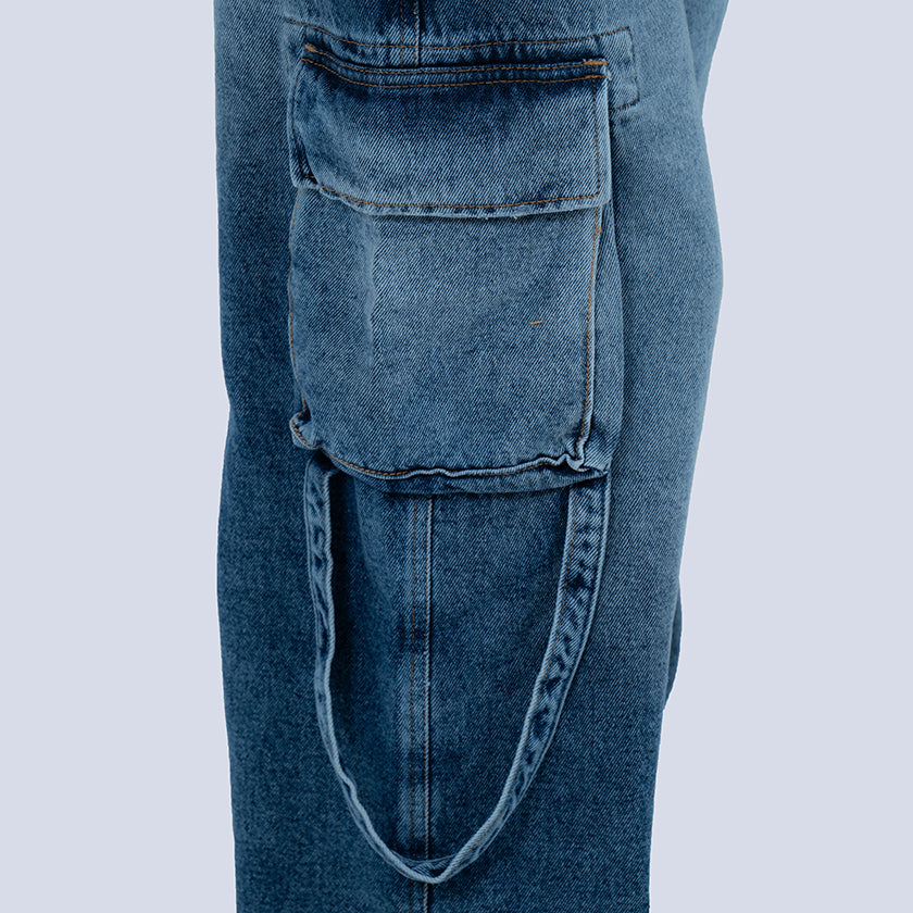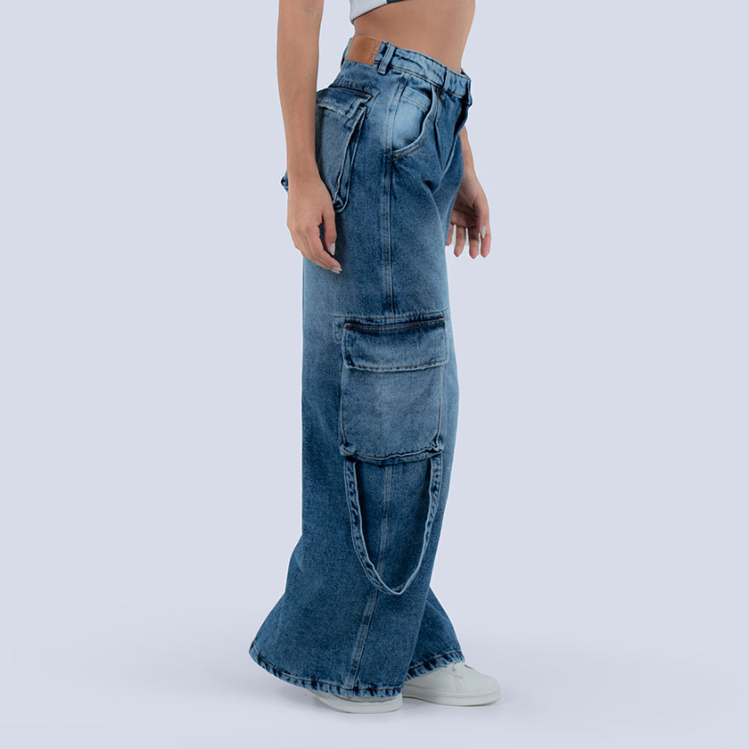 Pantalón de estilo cargo para mujer, en un color gris oscuro con un acabado lavado o desgastado. Se caracteriza por sus bolsillos grandes y funcionales en los laterales de las piernas. Además, presenta detalles de correas o tiras ajustables que cuelgan a los lados, añadiéndole un toque utilitario y moderno. La Moldería es más holgada, posiblemente de corte recto o ligeramente ancho en la pierna.