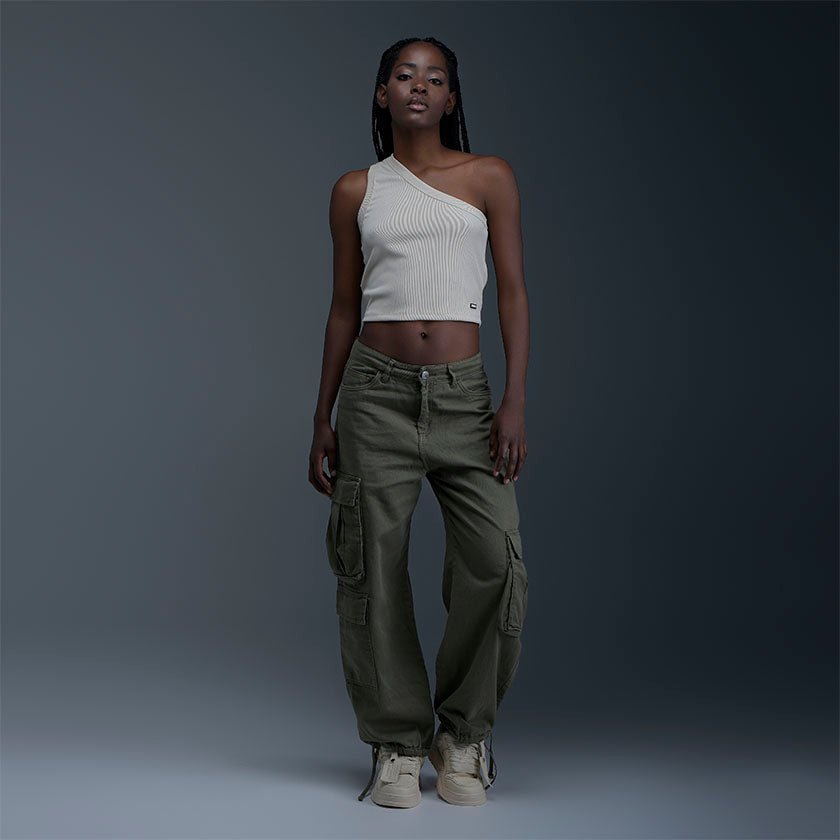 Pantalón para mujer. Presenta una silueta holgada y cordones para ajustar en la parte inferior, siendo más amplia en la pierna y bota. Llevan elásticos que se ajustan en la cinturilla, presenta bolsillos en los muslos y cordones para amarre en los tobillos.