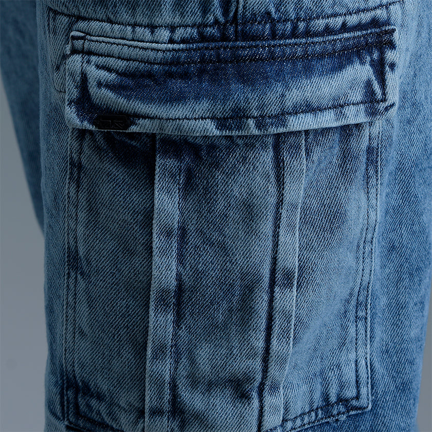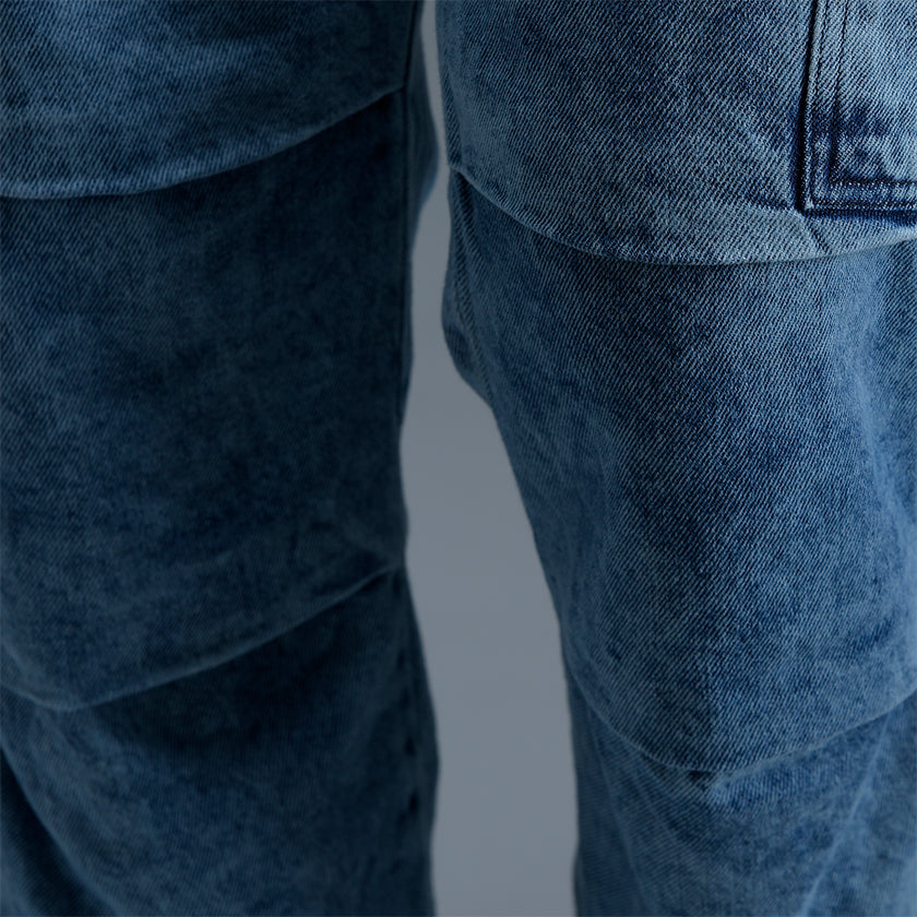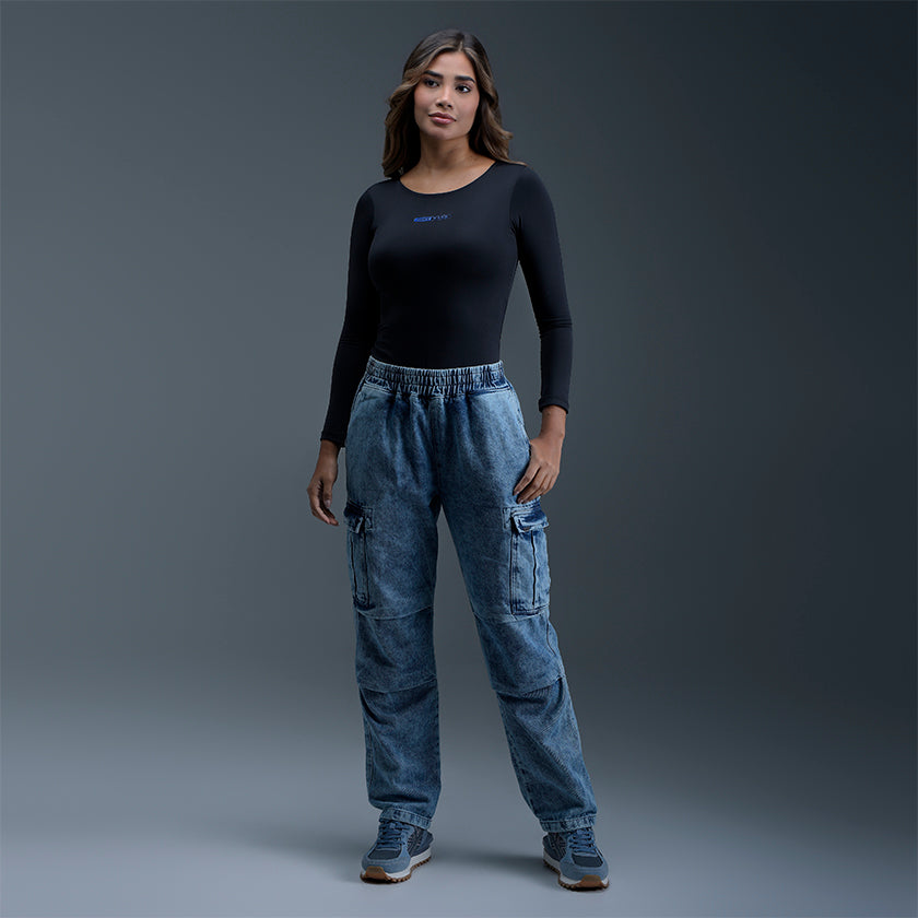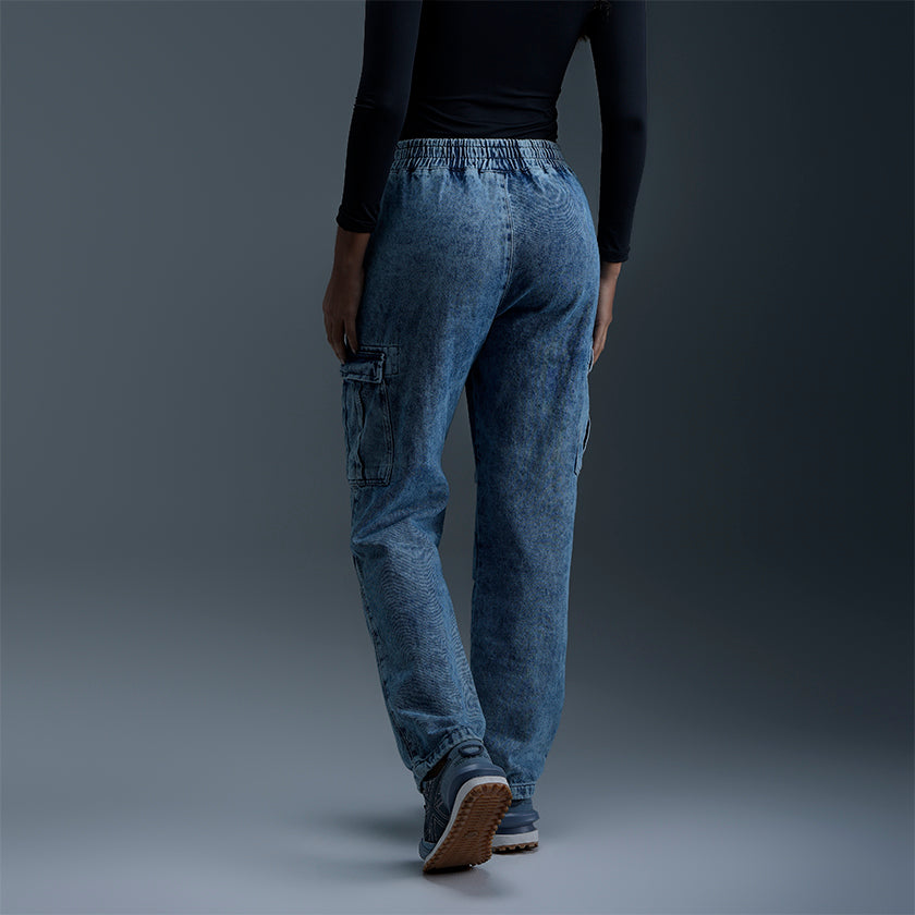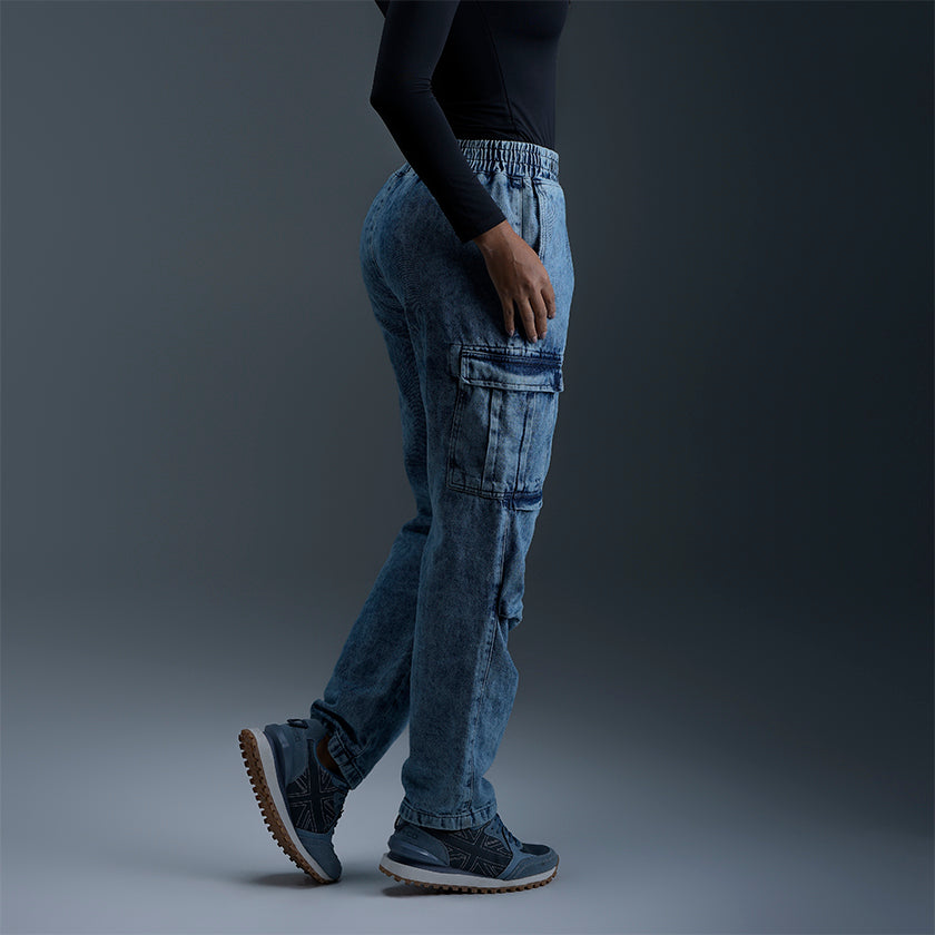 Pantalón de estilo cargo para mujer, en un color gris oscuro con un acabado lavado o desgastado. Se caracteriza por sus bolsillos grandes y funcionales en los laterales de las piernas. Además, presenta detalles de correas o tiras ajustables que cuelgan a los lados, añadiéndole un toque utilitario y moderno. La Moldería es más holgada, posiblemente de corte recto o ligeramente ancho en la pierna.