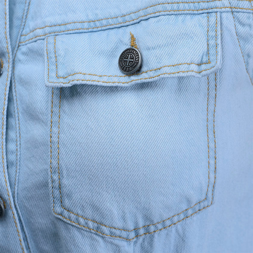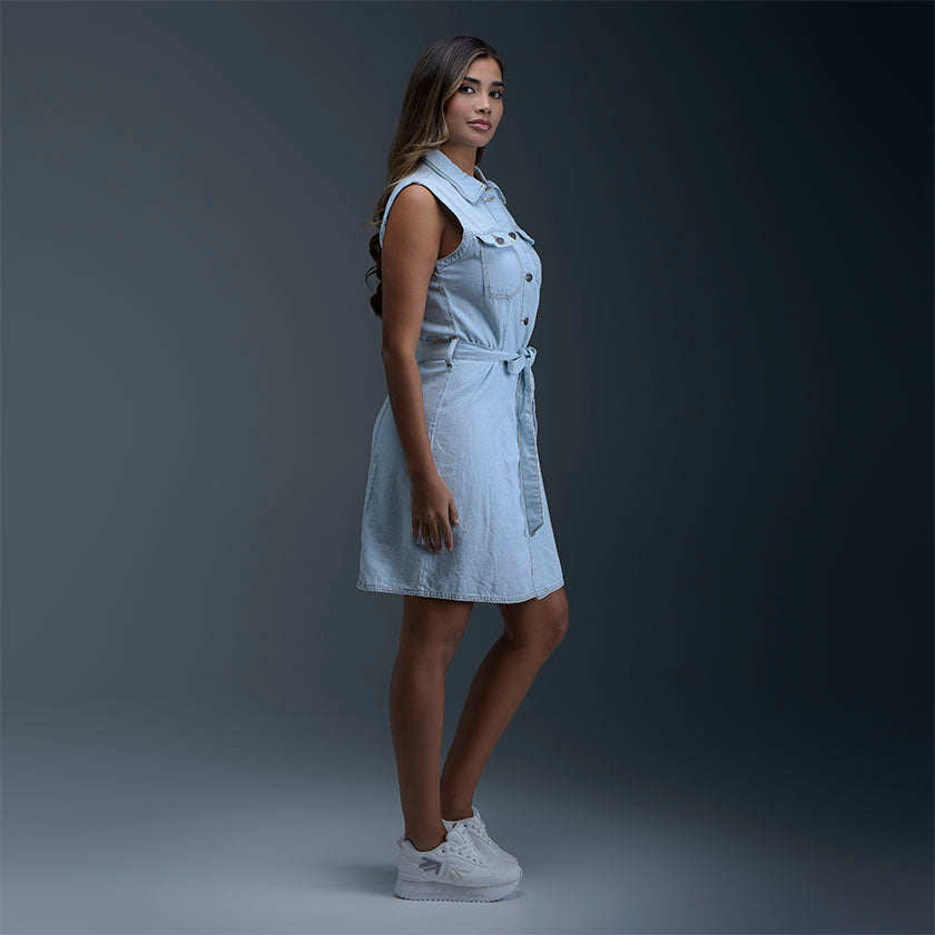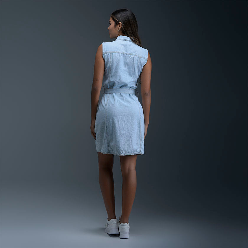 Vestido camisero sin mangas en tono azul claro, confeccionado en tejido denim de algodón suave para un ajuste cómodo y un estilo atemporal. Su diseño con cuello camisero, botones frontales y cinturón de amarre en la cintura realza la figura con un toque moderno y versátil. Elegante y fresco, perfecto para un look casual con estilo.