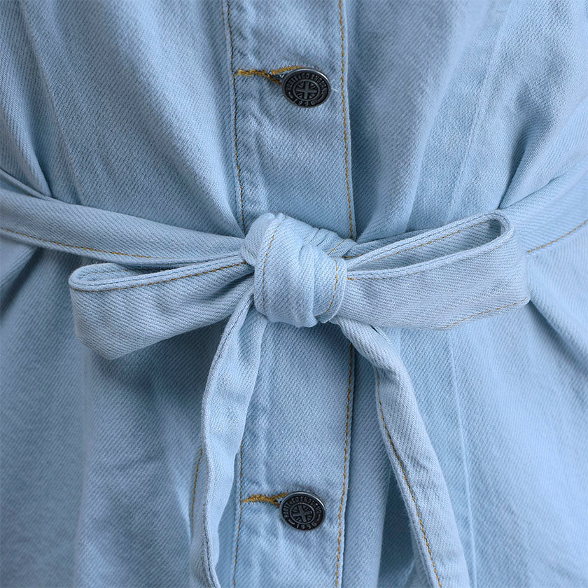 - Detalles: Cierre de botones frontal, bolsillos de parche con solapa en el pecho y cinturón de amarre de la misma tela.