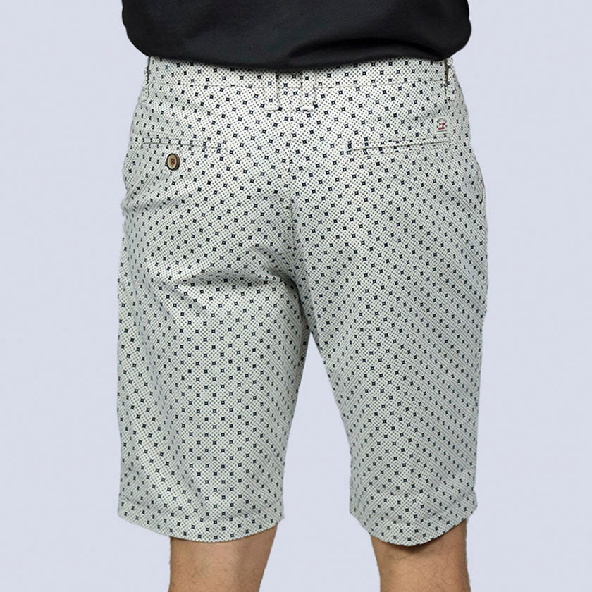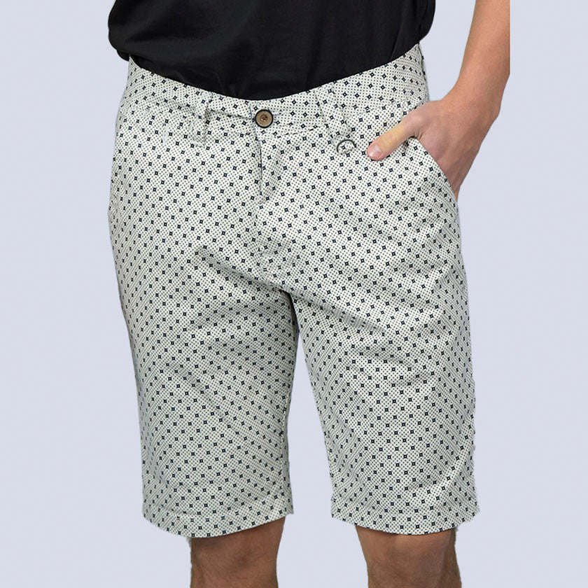 Bermuda para hombre presenta pieza de diseño en toda la prenda y marquilla ROOTT+CO en el bolsillo trasero junto con botón, cómoda ligeramente arriba de la rodilla.