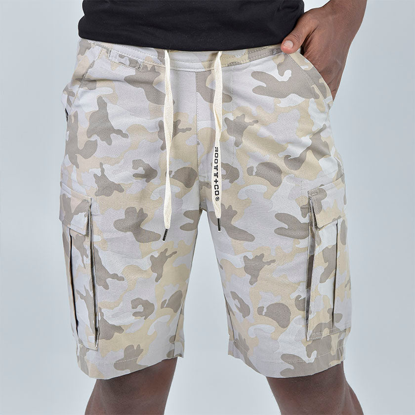 Bermuda cargo para hombre presenta marquilla ROOTT+CO en el bolsillo trasero junto con botón, cómoda ligeramente arriba de la rodilla, luce cordones ajustables.