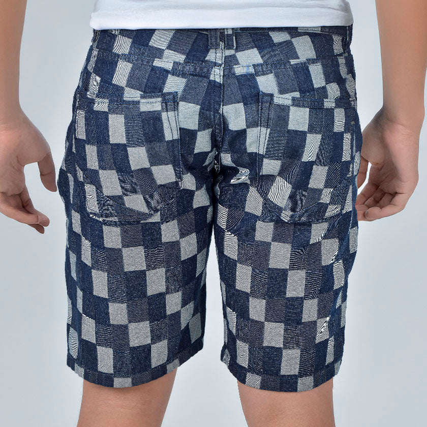 Bermuda denim para hombre presenta marquilla bandera ROOTT+CO en el bolsillo trasero, cómoda ligeramente arriba de la rodilla, presenta diseño en cuadros.