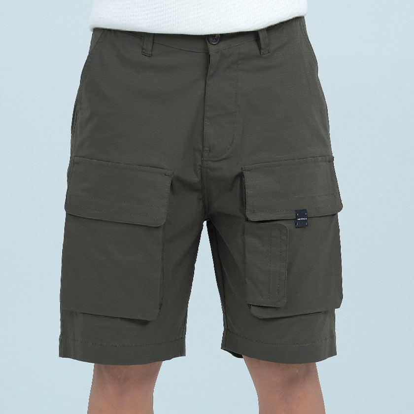 Bermuda cargo para hombre presenta bolsillos en los muslos y marquilla ROOTT+CO en el bolsillo trasero, cómoda ligeramente arriba de la rodilla.