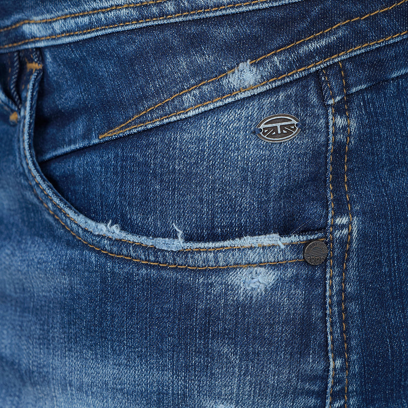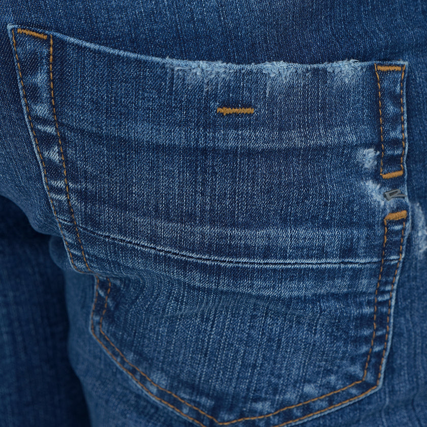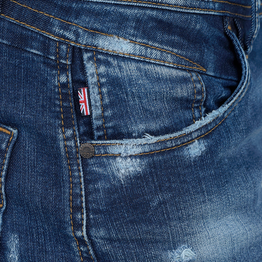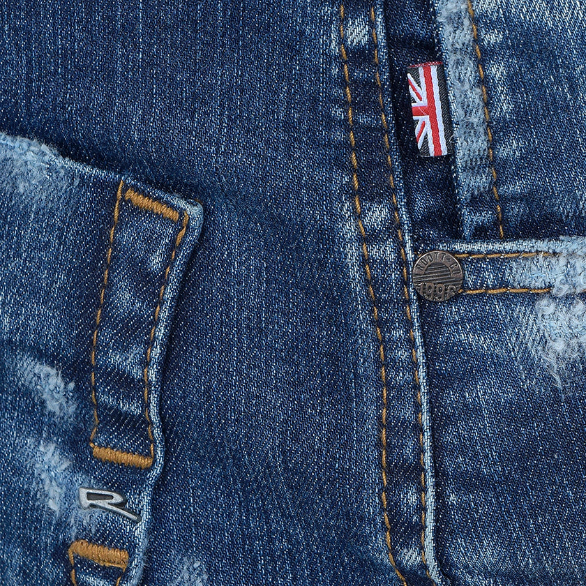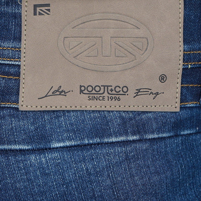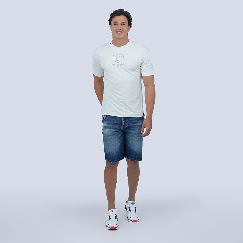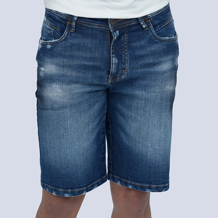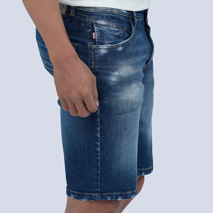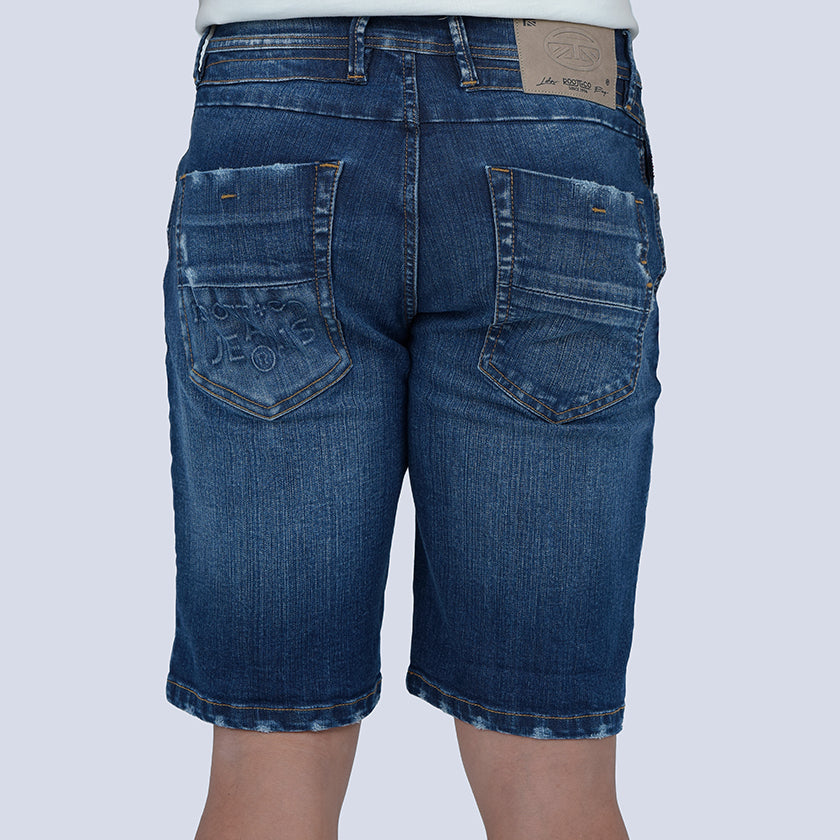 Bermuda denim para hombre. Presenta marquilla bandera ROOTT+CO en el bolsillo trasero, cómoda ligeramente arriba de la rodilla.