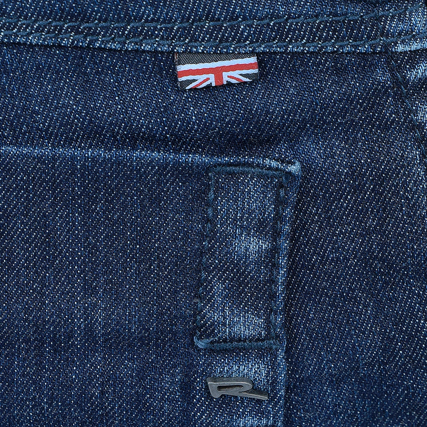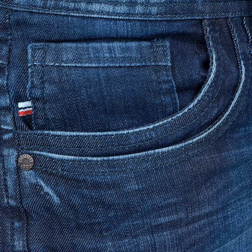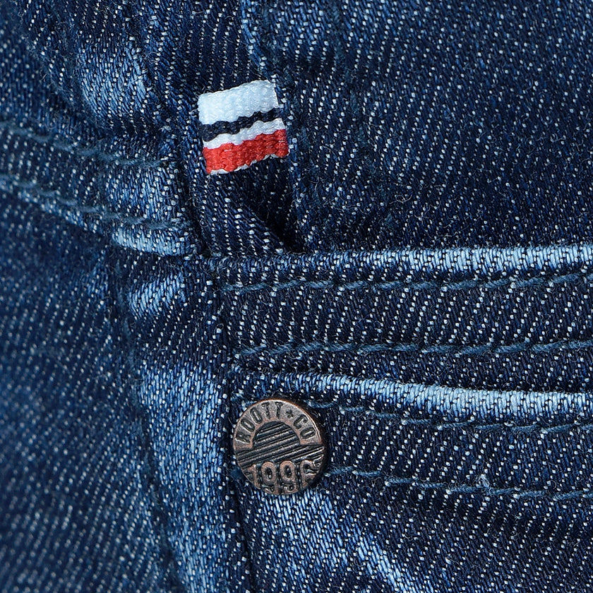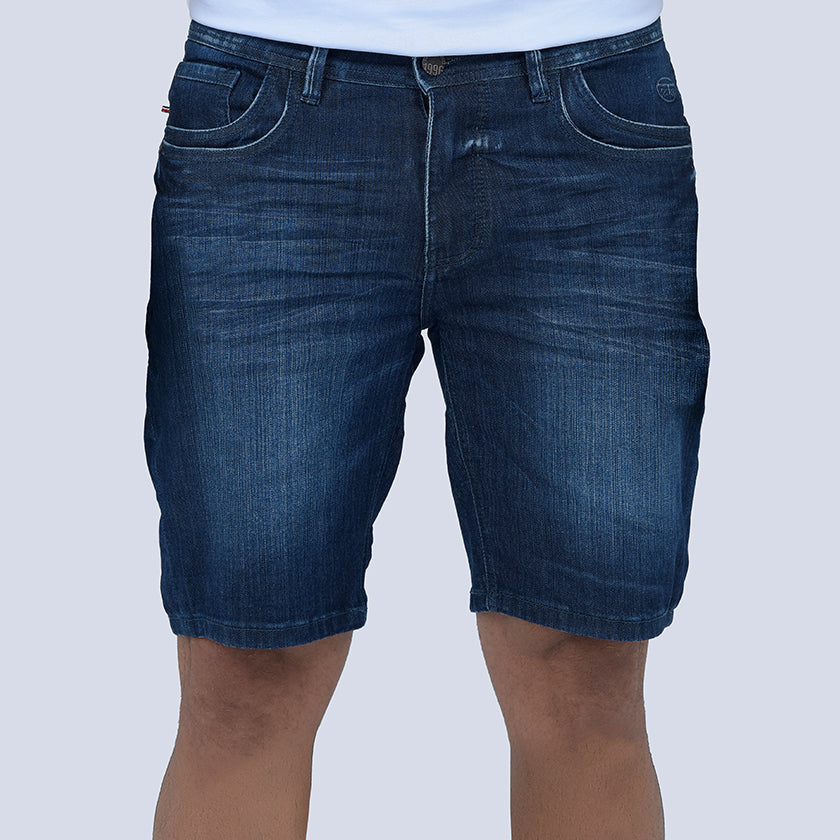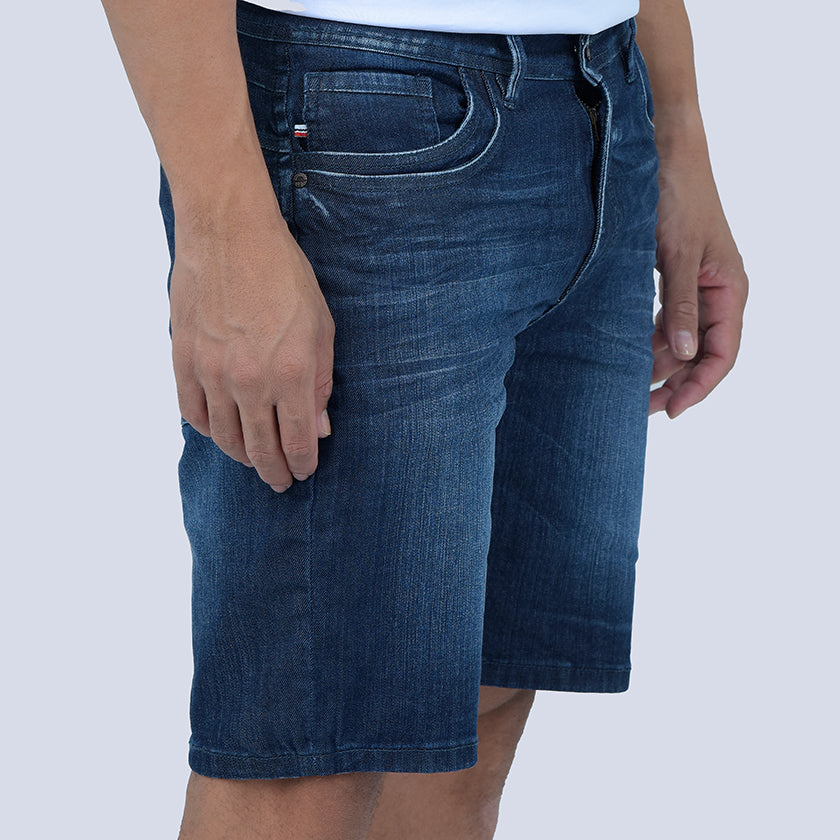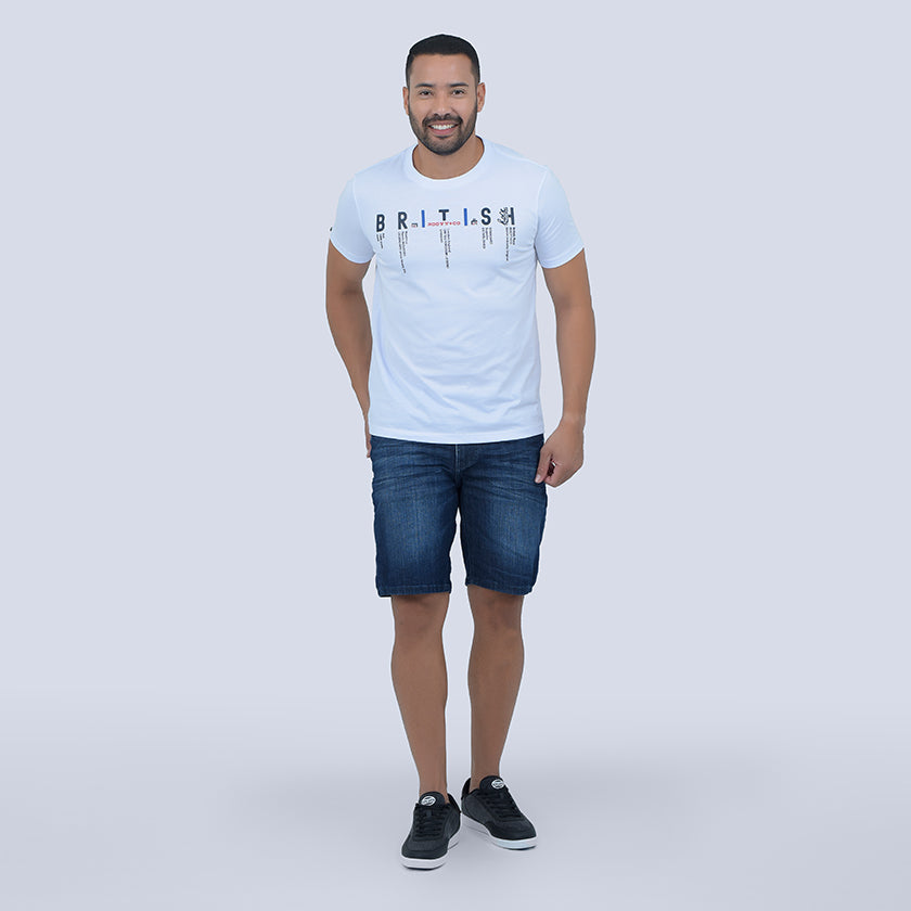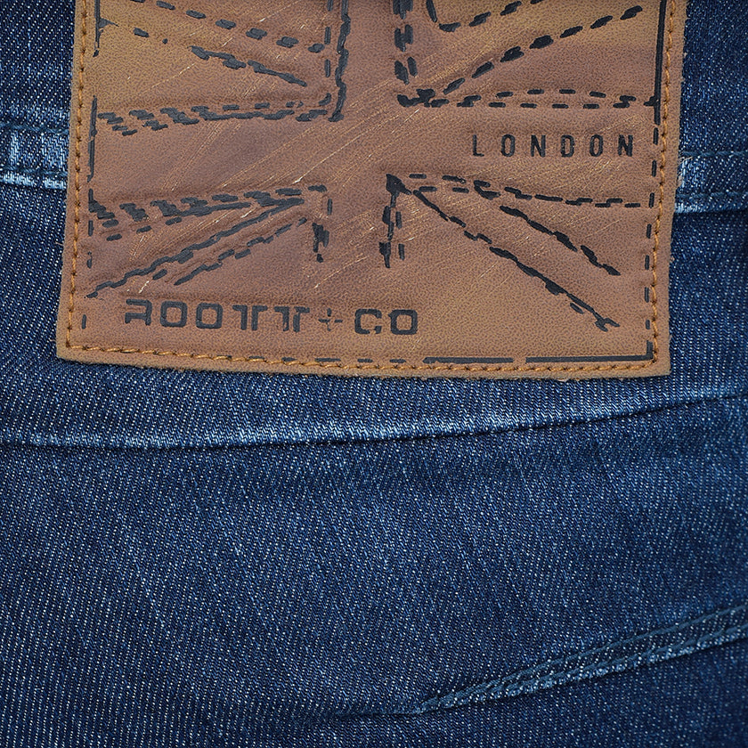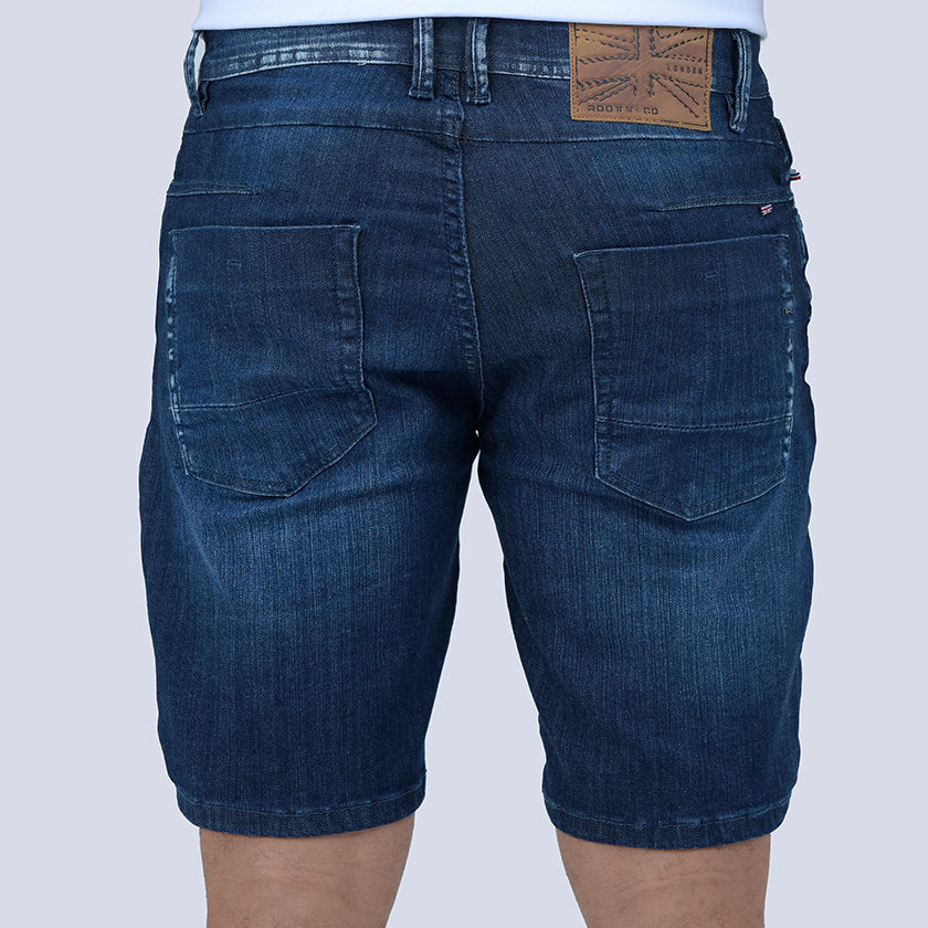 Bermuda denim para hombre. Presenta marquilla bandera ROOTT+CO en el bolsillo trasero, cómoda ligeramente arriba de la rodilla.