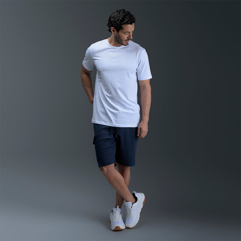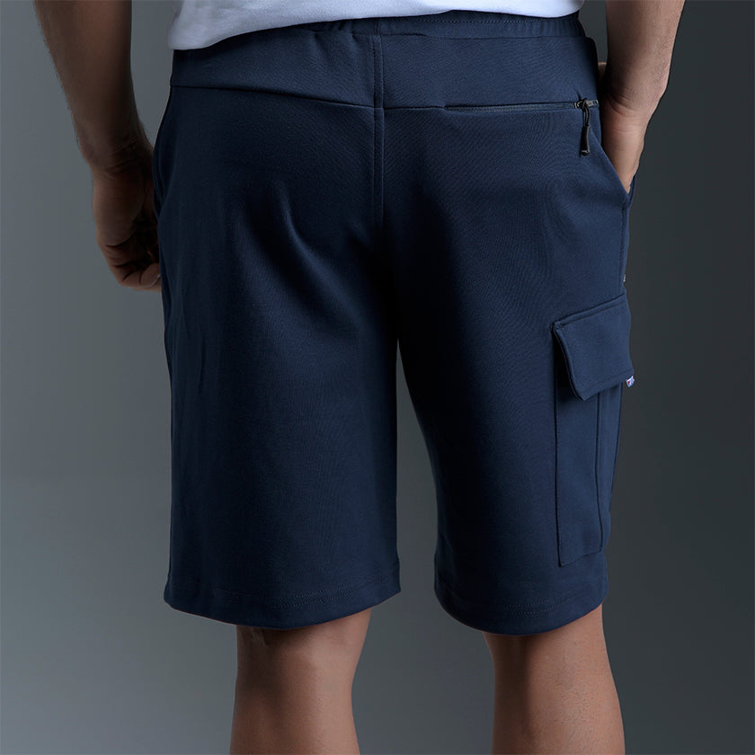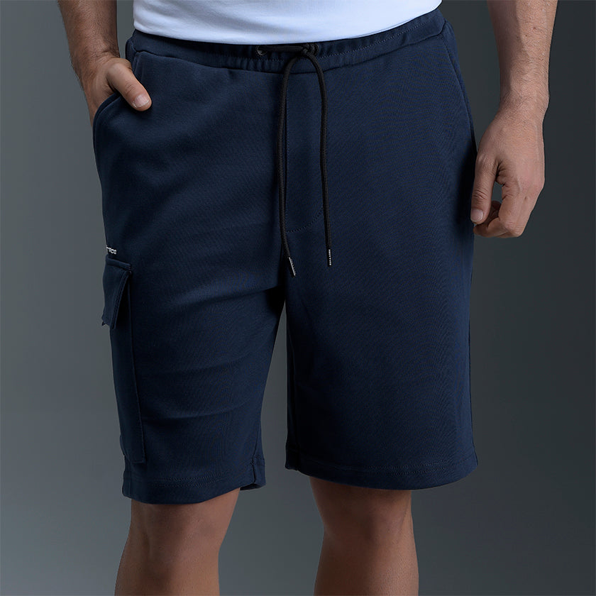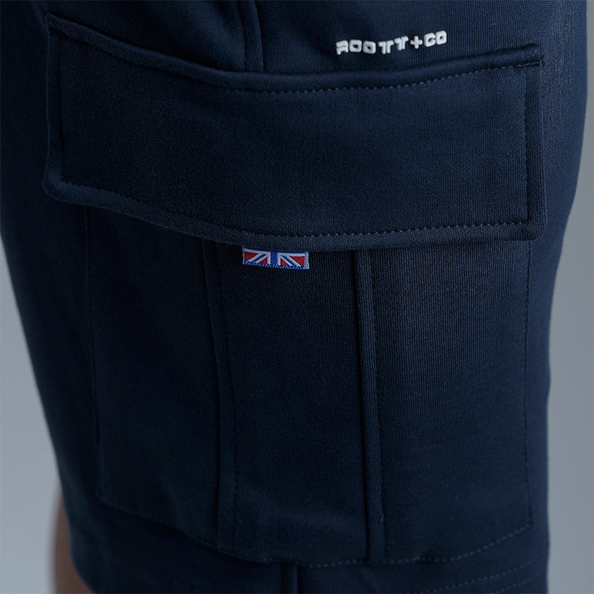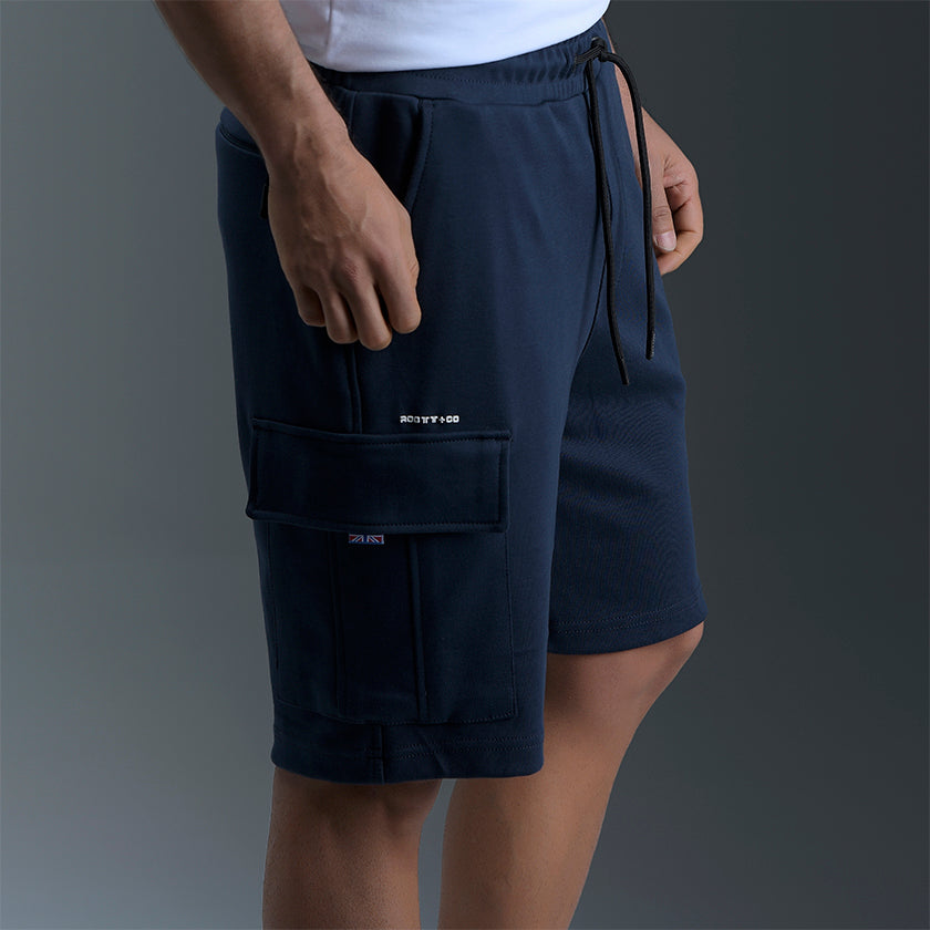 Bermuda cargo para hombre presenta bolsillos en los muslos y marquilla ROOTT+CO en el bolsillo trasero, cómoda ligeramente arriba de la rodilla.