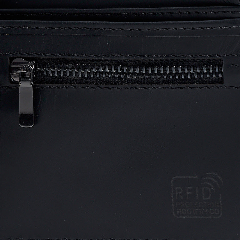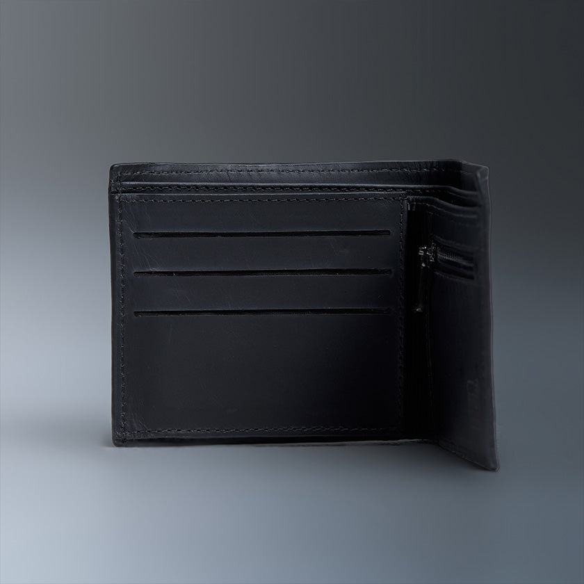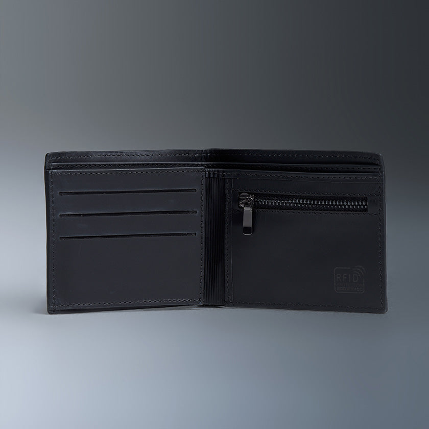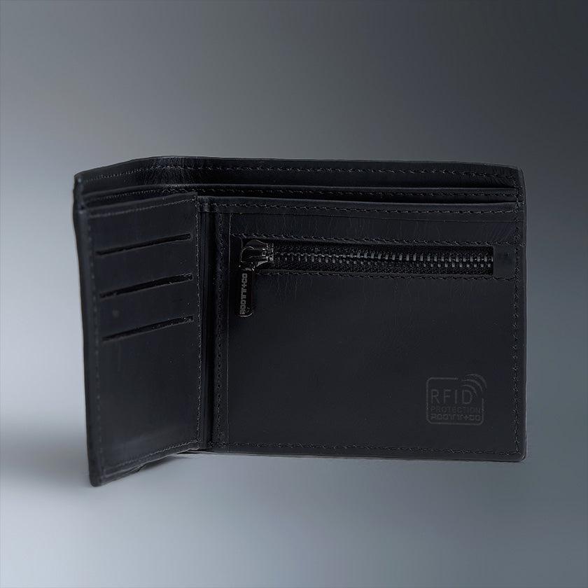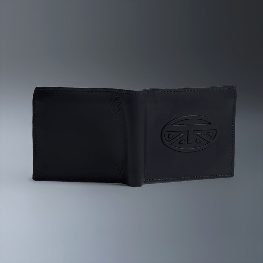 Esta billetera de ROOT+CO está confeccionada en cuero negro de alta calidad, con un diseño elegante y atemporal. En la parte frontal destaca el logotipo en relieve de la marca, aportando un detalle distintivo y sofisticado. Su construcción con costuras firmes garantiza resistencia y durabilidad, mientras que su estilo minimalista la convierte en un accesorio versátil, ideal tanto para el día a día como para ocasiones más formales.