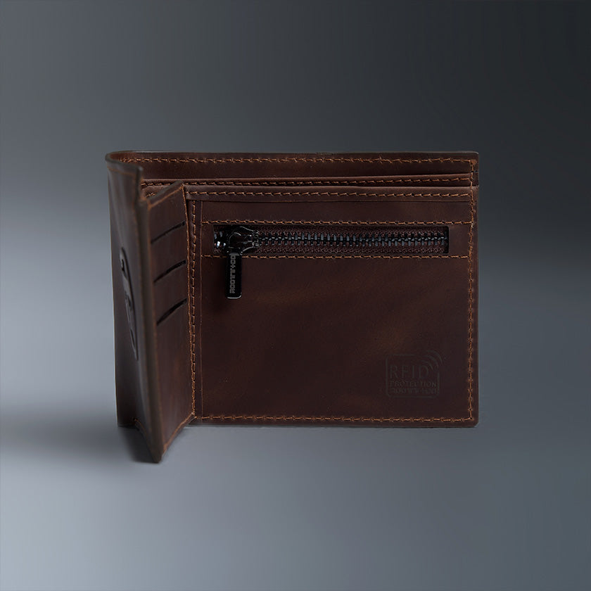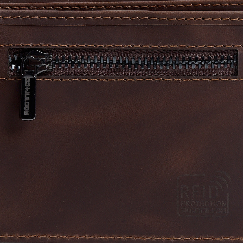 Esta billetera de ROOT+CO está confeccionada en cuero negro de alta calidad, con un diseño elegante y atemporal. En la parte frontal destaca el logotipo en relieve de la marca, aportando un detalle distintivo y sofisticado. Su construcción con costuras firmes garantiza resistencia y durabilidad, mientras que su estilo minimalista la convierte en un accesorio versátil, ideal tanto para el día a día como para ocasiones más formales.