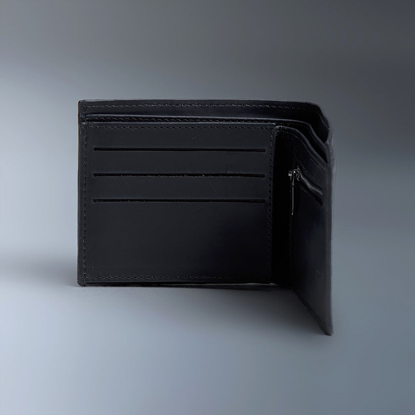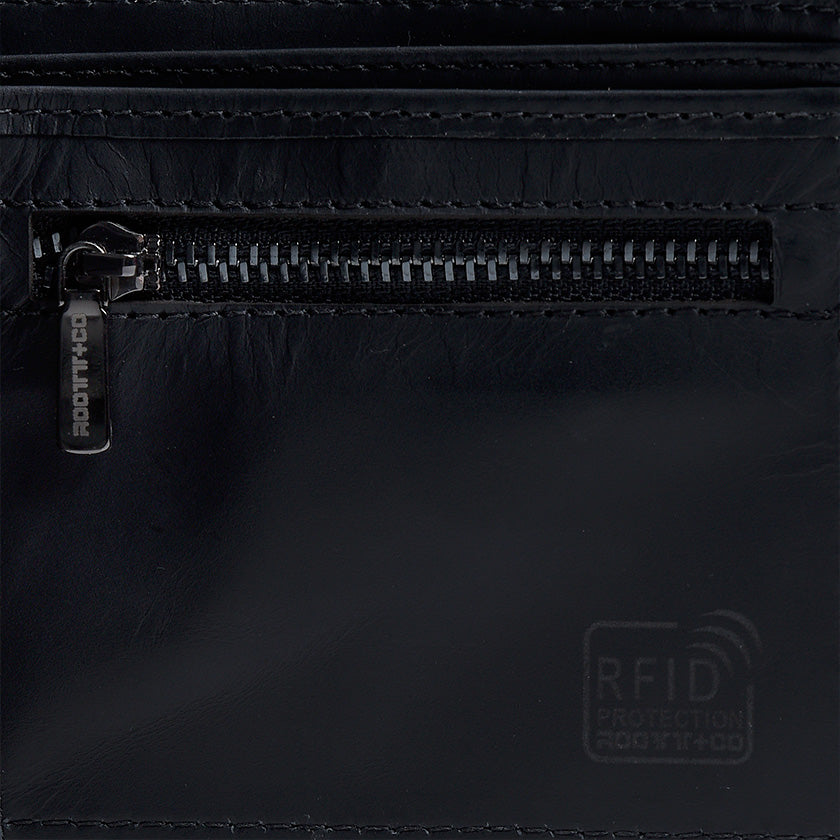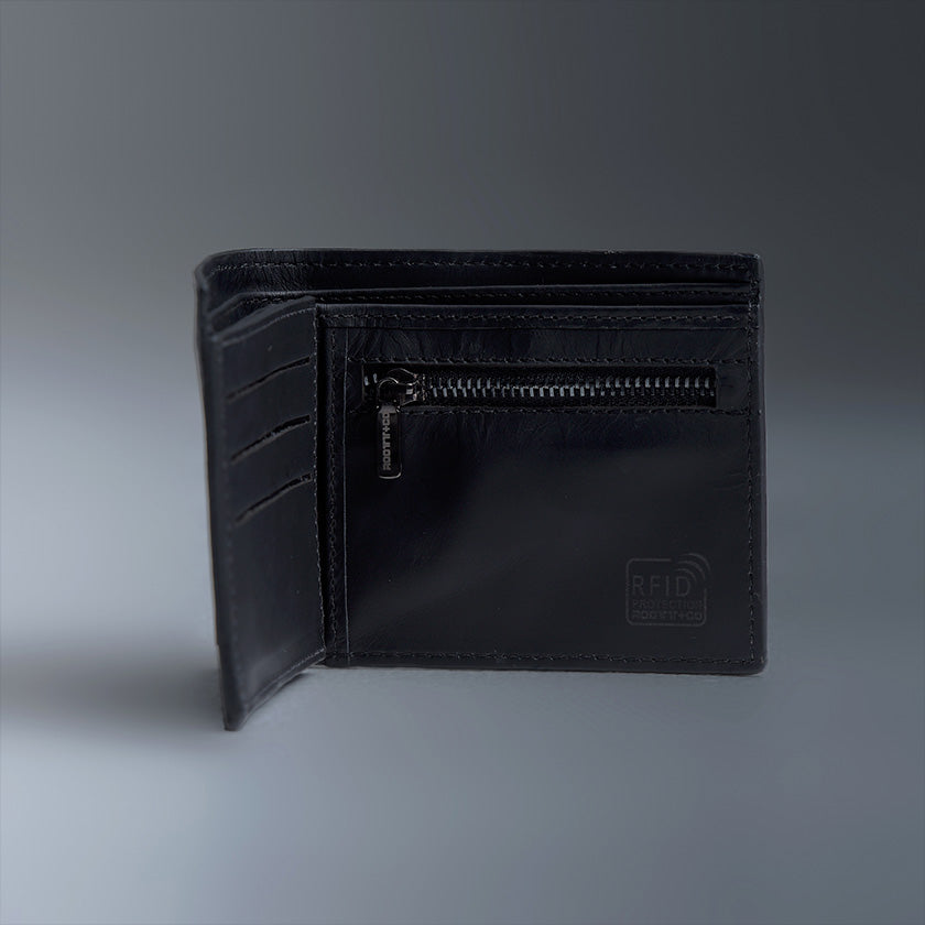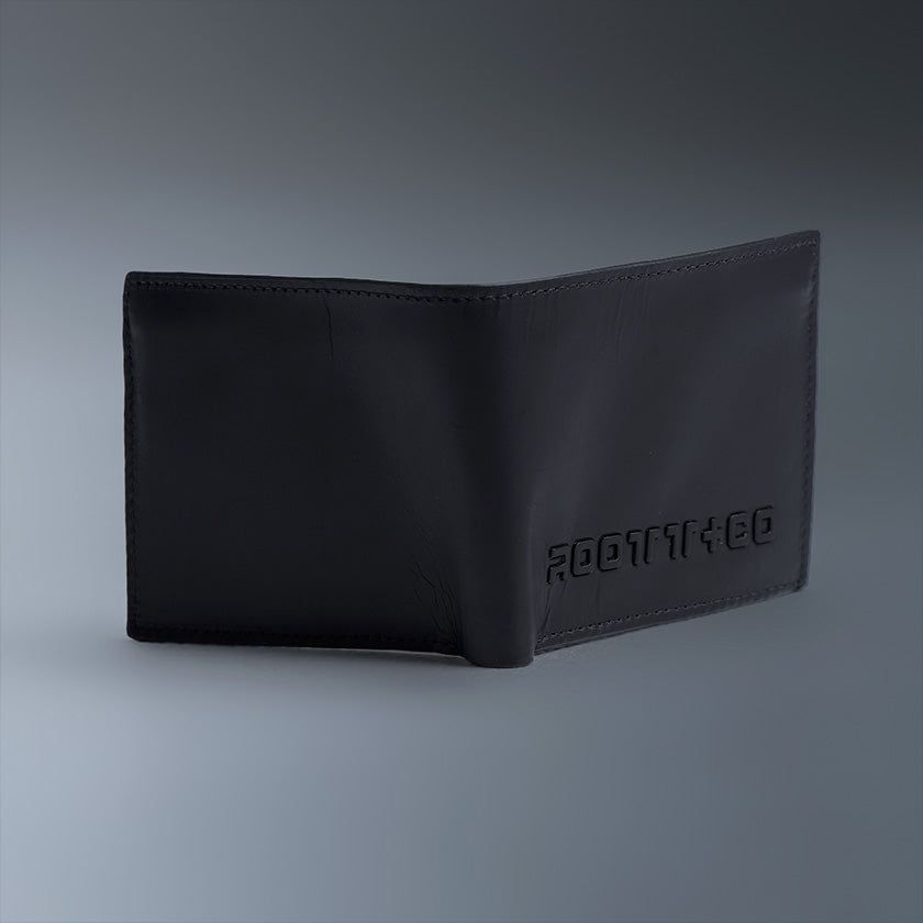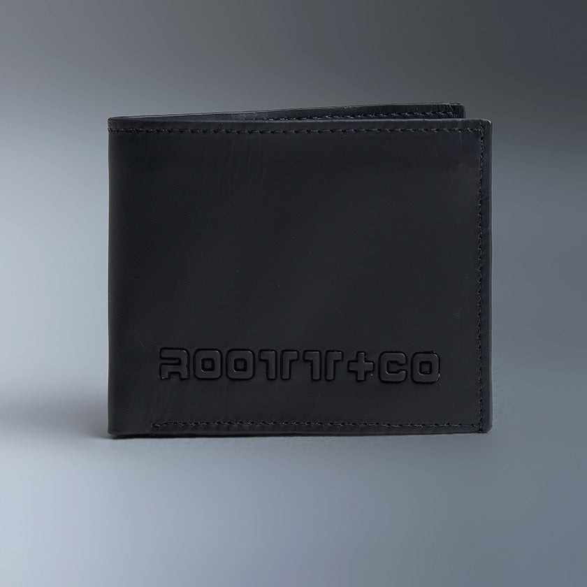 Esta billetera de ROOT+CO está confeccionada en cuero negro de alta calidad, con un diseño elegante y atemporal. En la parte frontal destaca el logotipo en relieve de la marca, aportando un detalle distintivo y sofisticado. Su construcción con costuras firmes garantiza resistencia y durabilidad, mientras que su estilo minimalista la convierte en un accesorio versátil, ideal tanto para el día a día como para ocasiones más formales.