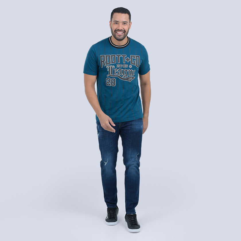 Camiseta para hombre. Presenta gráfico ROOTT+CO en la parte frontal, luce marquilla código en el costado y marquilla banderilla ROOTT+CO.