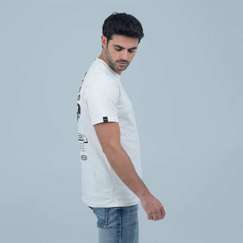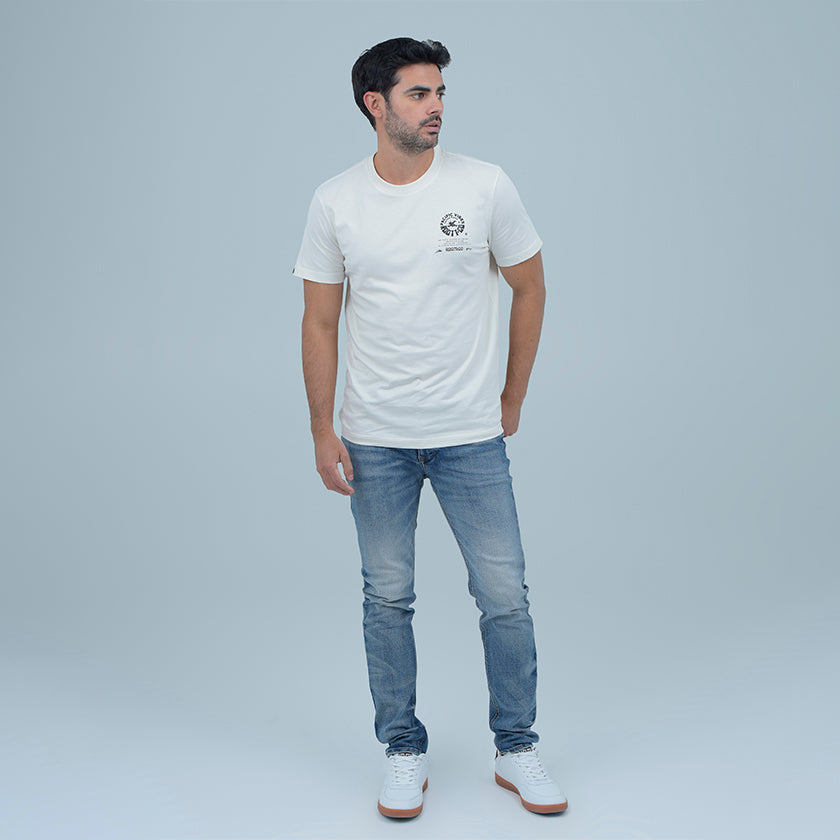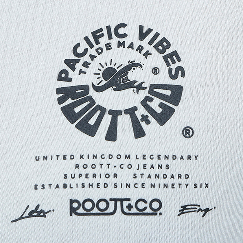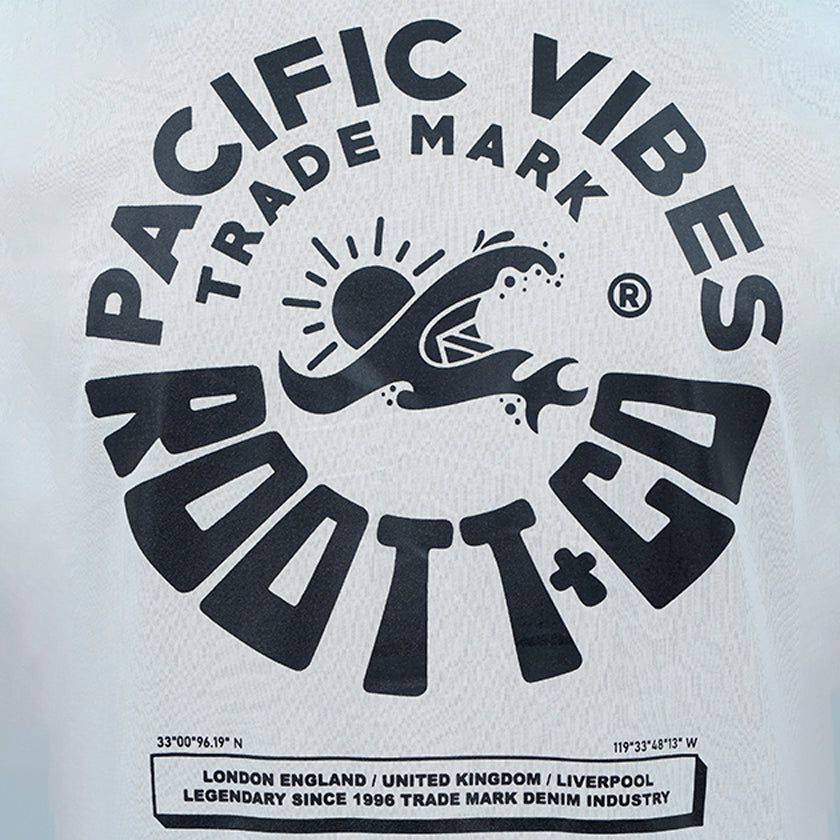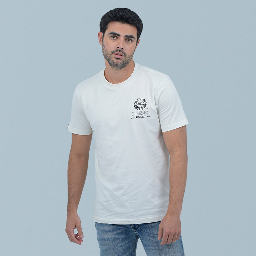 Camiseta para hombre. Presenta gráficos ROOTT+CO en la parte delantera, diseño en mangas y marquillas de la marca ROOTT+CO estampado de la colección Pasific Vibes .