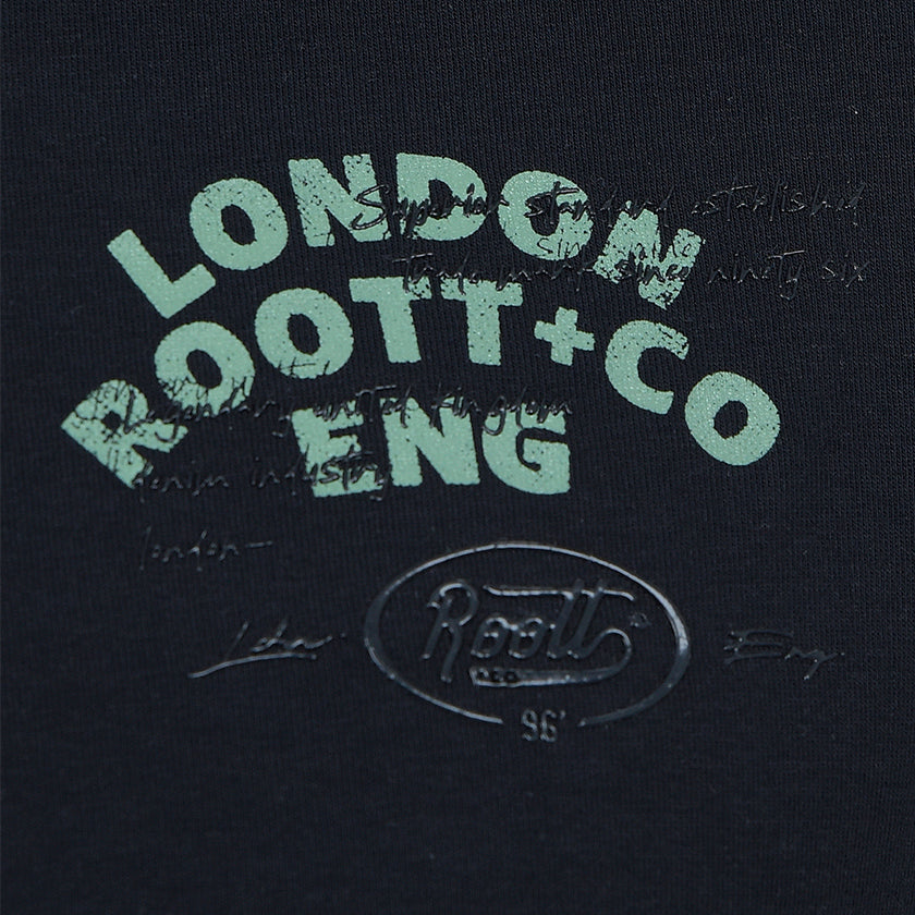 Camiseta para hombre. Presenta gráficos ROOTT+CO en la parte delantera, diseño en mangas y marquillas de la marca ROOTT+CO.